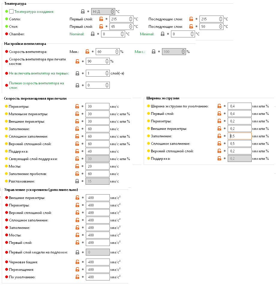 Доброго времени суток, первый раз пишу на этом форуме. Недавно взял PLA FDPlast для печати фигурки. Соответственно настроил принтер под лучшее качество печати: сопло 0.3 мм, слой 0.08 мм, остальное прикреплю скриншотами. При печати возникла проблема: переодически притер пропускает участки слоя - на поверхности модели возникают поры, а поддержки получаются ажурными и ломаются. При печати тестового кубика однако таких проблем нет, и о недоэкструзии говорить вроде как не приходится, крышка пробного кубика выходит хорошей, да и в случае недоэкструзии, как мне кажется, выходили бы плохими все боковые поверхности, а не их часть. В общем, прошу помощи, наводки на корень проблемы.