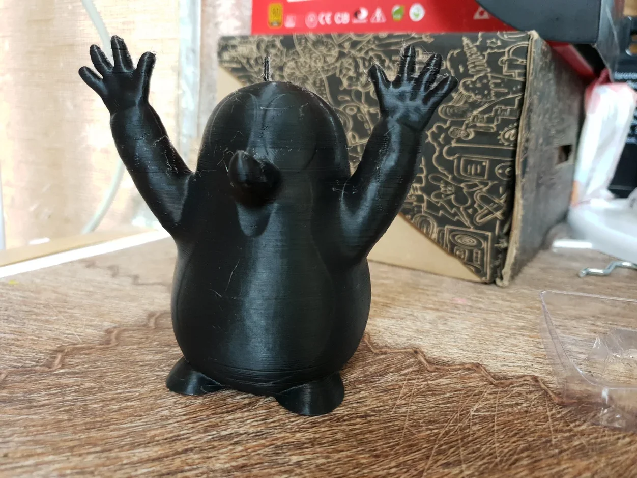 Видно, что у кротика всего 1 волос на голове :(. Печать получилась сопливенькая, но наверное ничего уже с этим не поделать, на меньшей температуре иногда щёлкает экструдер, ретракт сильнее не сделать - титановый heatbreak, флоу уже слегка уменьшен.