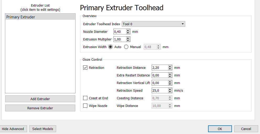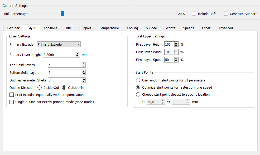 Настройки симплифая примерно такие, примерно, т.к. варьируются с небольшими изменениями: Пишите, если нужна ещё дополнительная информация, будет здорово узнать как вы у себя настраивали подачу, кроме как подбором коэффициентов. Может быть есть особенности настройки скоростных режимов. Для калибровки использовал следующий ресурс, но в процессе возникло ощущение, что через G-код принтер печатает одним образом, а через simplify с теми же основными настройками совершенной по-другому.