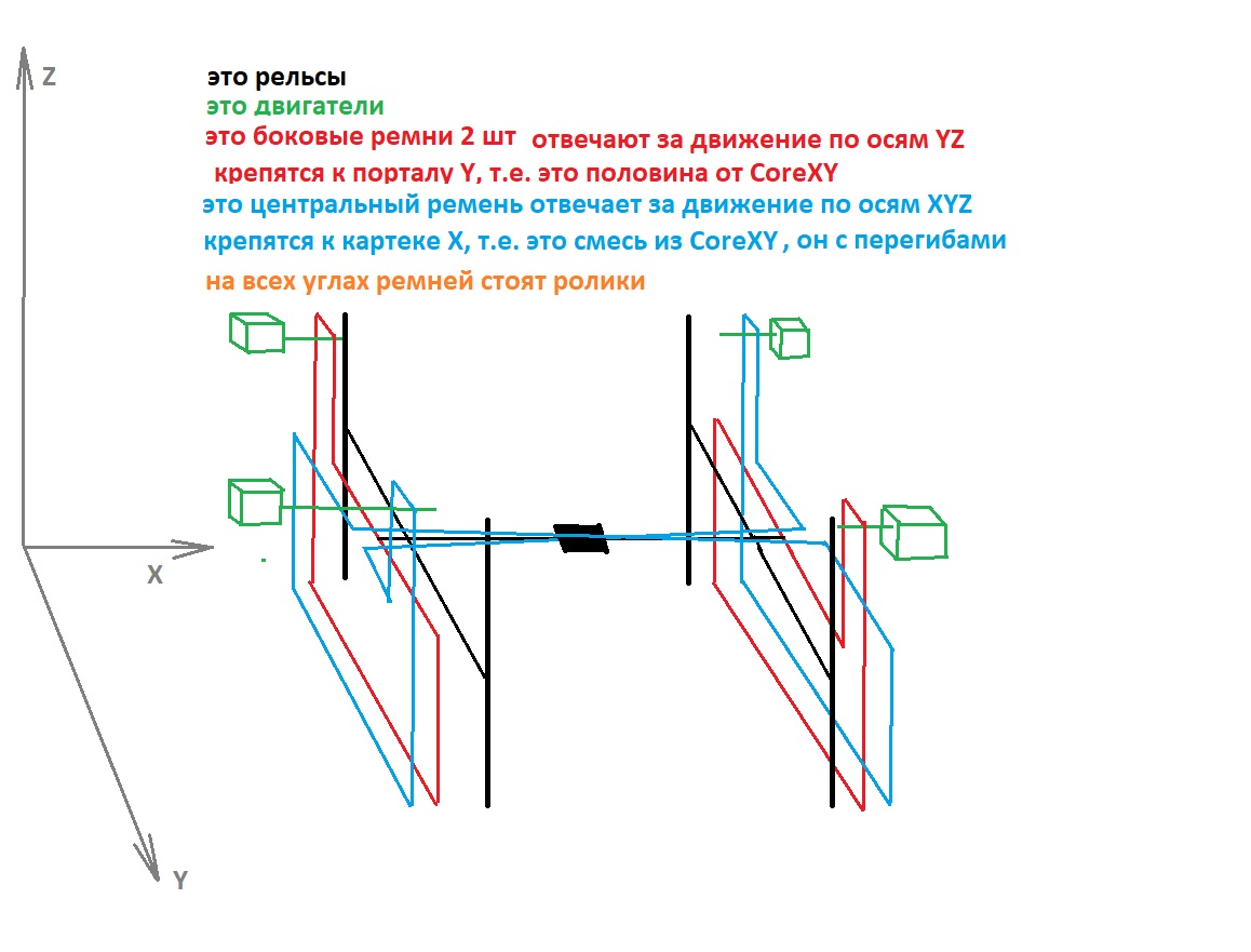 Не могу данную кинематику построить в солидворксе. Центральный(голубой) ремень не строиться, т.к. плоскость роликов не параллельна. Пришлось набросать в пайнте.
