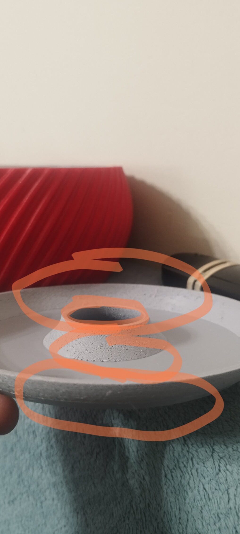 Внешний слой начинает печатать комкая пластик и размазывает делая рыхлую структуру как на фото. Пройдя половину окружности стабилизируется и кладет ровно. В итоге половина внешнего слоя в паутине и напоывах, половина нормальная.
