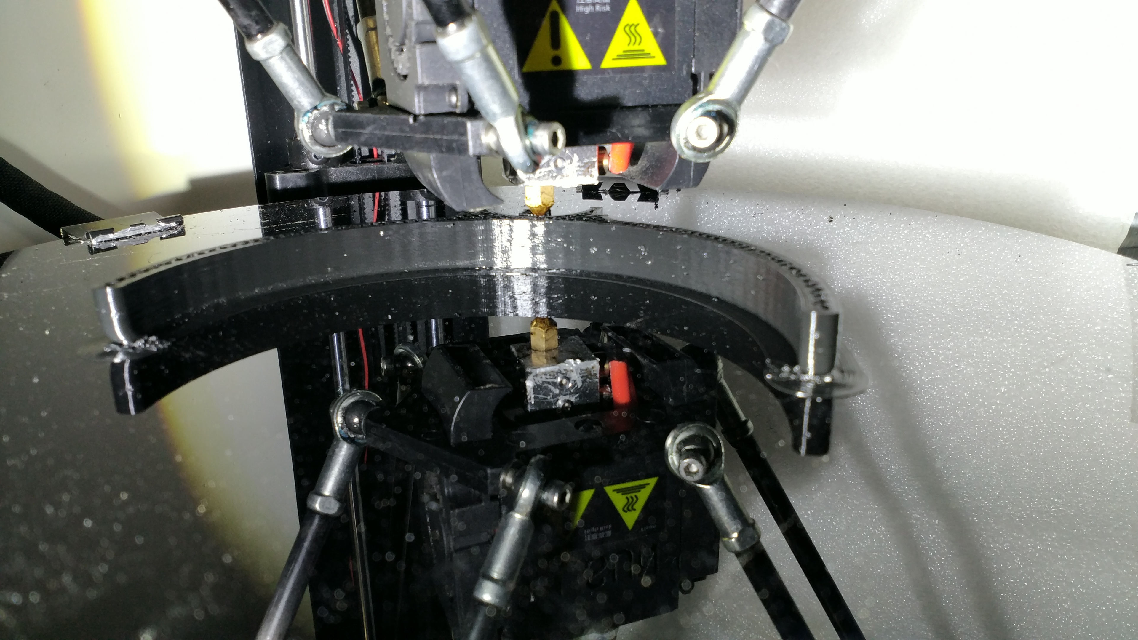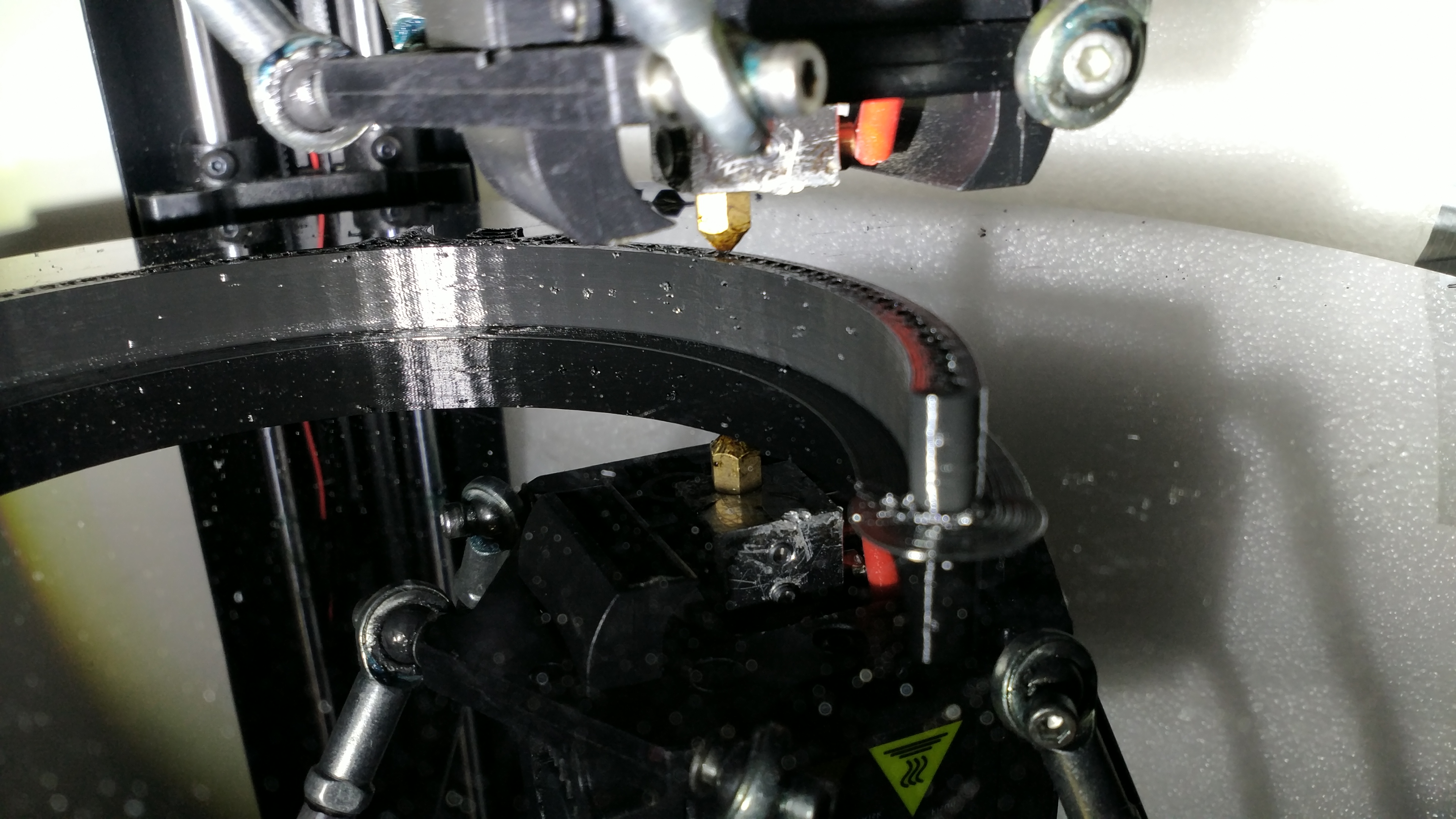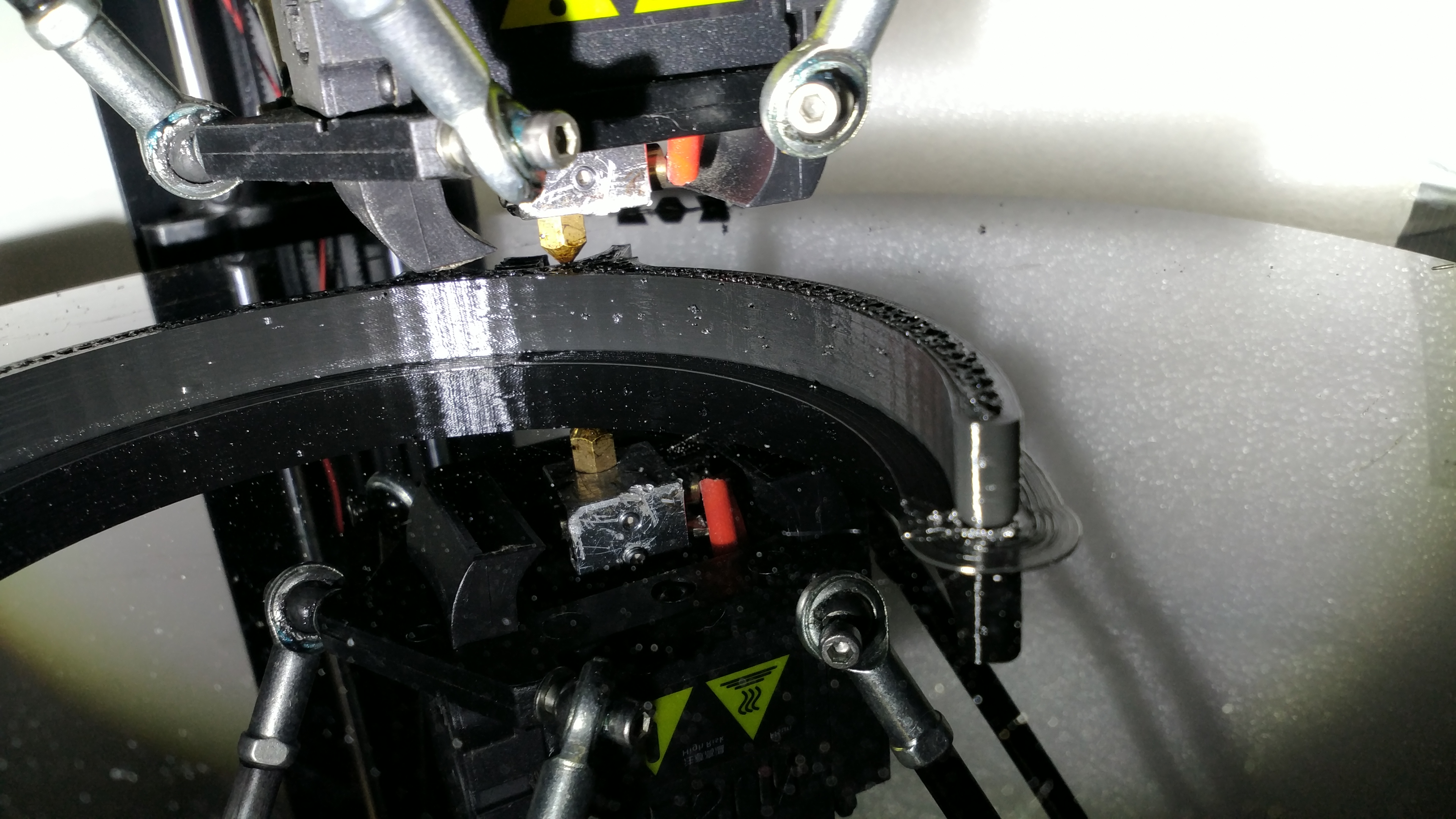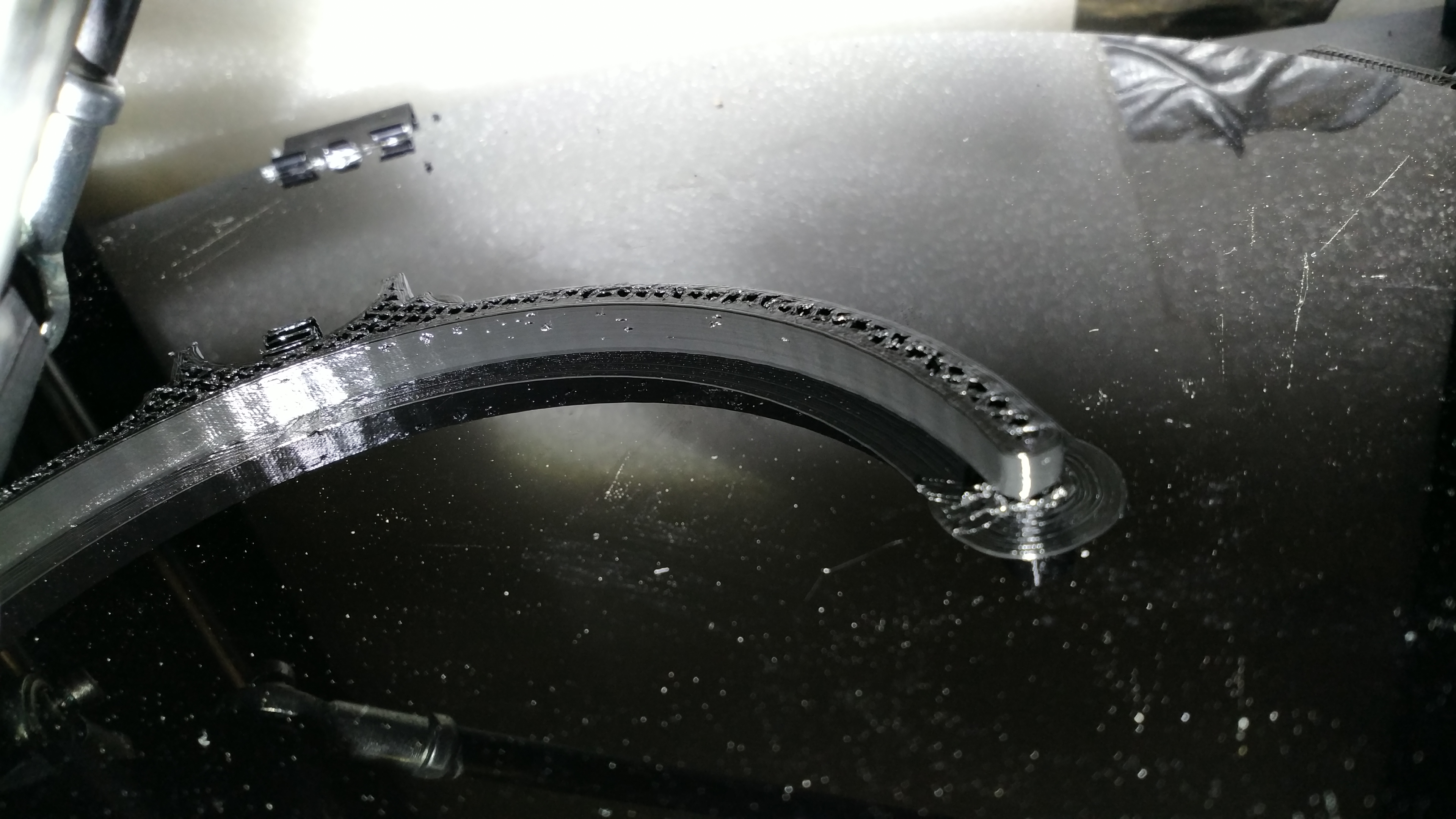 Наблюдения: идет печать заполнения, потом переходит к периметру и пока сопло едет в области детали оставляет за собой маленькие капельки (очень маленькие), которые в процессе печати частично разглаживаются, а какие то превращаются в то что на фото. При печати заполнения тоже иногда остаётся торчать пластик который в последствии цепляет сопло и тащит на себе пока он не отлипнет где нибудь еще :) Это не ретракт в начали или конце печати слоя.