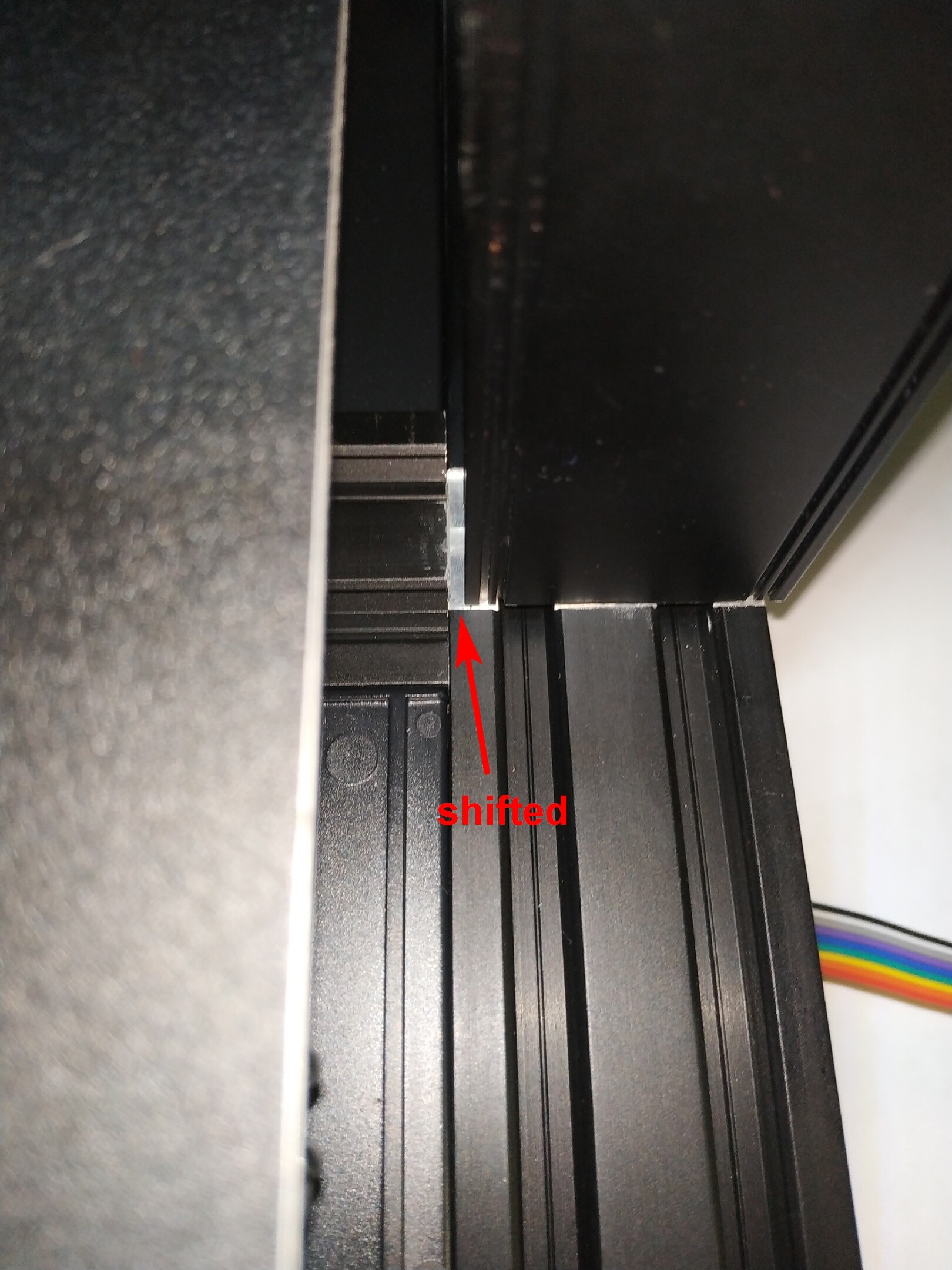 Принтер приходит уже частично собранный. Рама с двигателями и экструдером собрана и по инструкции её надо просто привинтить к столу. Проблема в том, что если я устанавливаю одну вертикальную направляющую точно на место, то вторая вертикальная направляющая сдвигается наружу примерно на 3 мм. Т.е. рама явно собрана криво. Где и что надо отрегулировать, чтобы вертикальные направляющие вставали точно на место? И инстукция и видеоинструкция не особо помогает, там всё собрано ровно. Фото с пояснениями и фото принтера в целом.