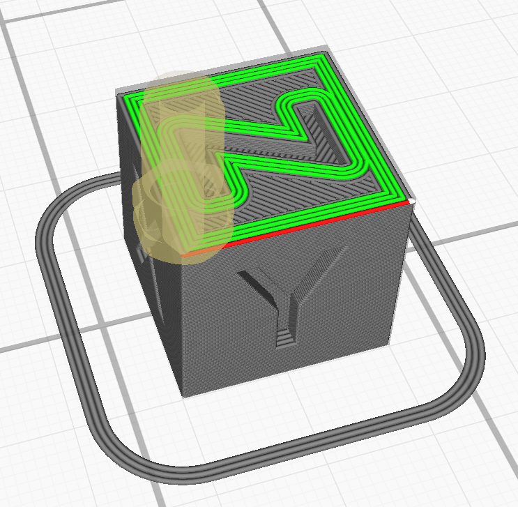Везде ретракт 6.5 на скорости 25, Accel/Acce2Decel=3000/2000Первый куб — PLA 210℃, скорость 150, Pressure Adv=0, Зелёный — снова PLA, скорость 100, PA=0.2Жёлтый —PETG 240℃, скорость 100, PA=0.2Темнозелёный — PETG 250℃, скорость 100, PA=0.2Второй темнозелёный — PETG 250℃, скорость 100, PA=0.4Вот в Куре начало одного из тех внешних периметров где натёк: