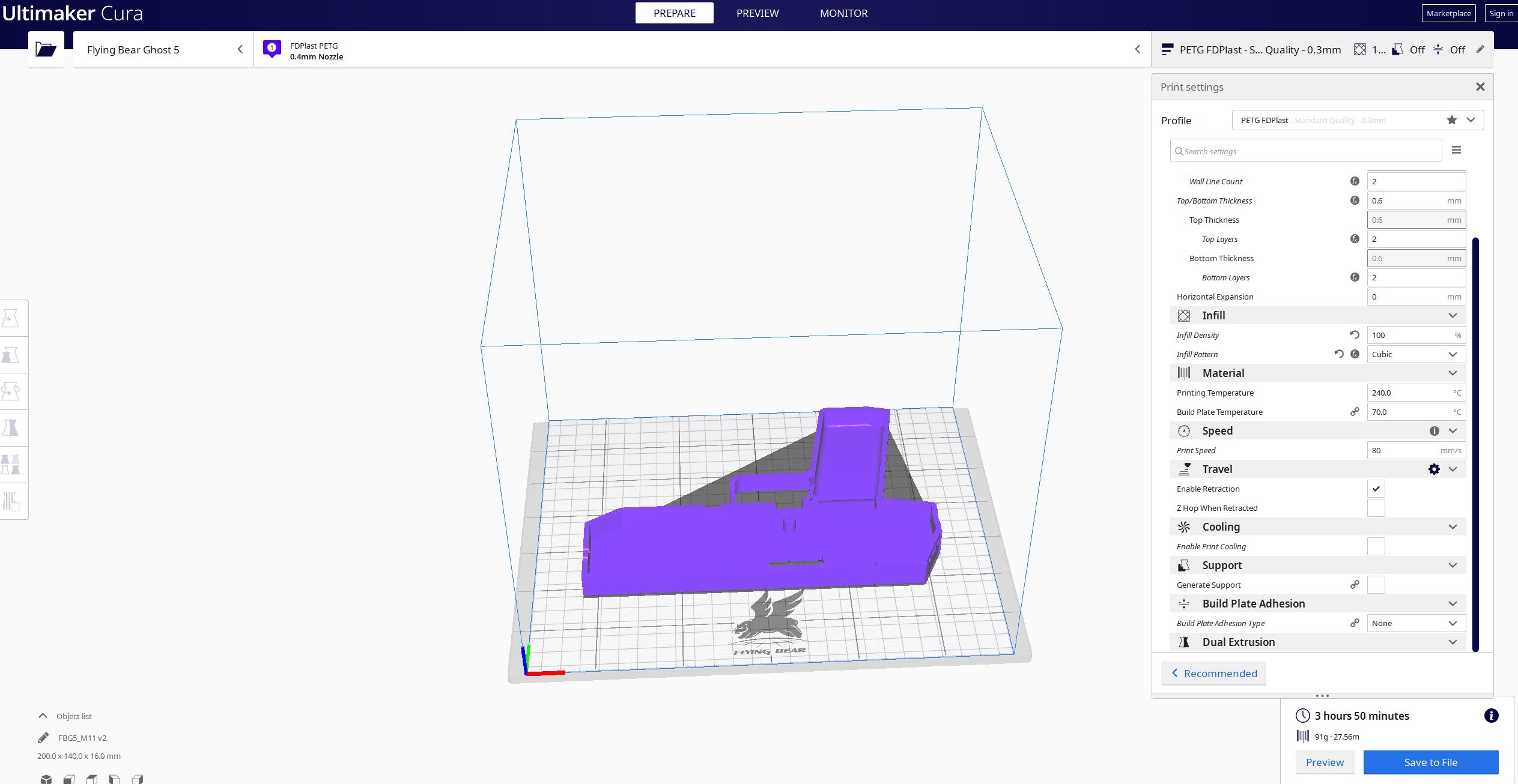 Думаю, не поменять ли свой Ender 3 Pro на FlyingBear 5. Апгрейд интересен прежде всего возможность сократить время печати больших деталей. Прикинул в Cura, сколько будет печататься достаточно габаритная деталюшка на том и на другом принтере, получилась очень большая разница: