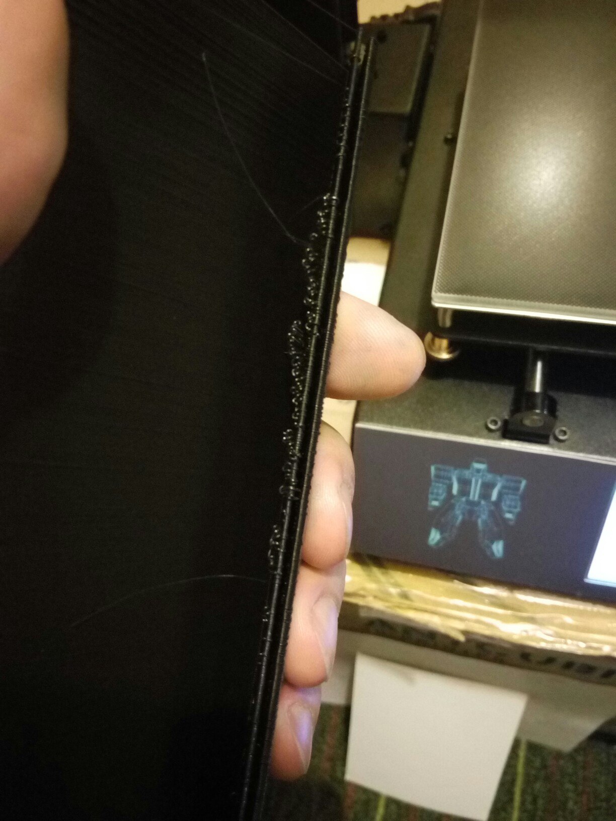 На 30% печати решил сделать настройки как на скрине слайсера, до 30% была температура хотэнда 200, и скорость печати 100 при этом периодически стучал экструдер, на моменте, после отката филамента (предполагаю, что причина в том, что хотэнд не успевает расплавить на такой скорости филамент).1) С чем связаны волны на детали?2) На задней части детали сопли - из-за чего это?Не совах есть мелкие огрехи, но думаю, что неплохо)3) Почему мог все таки стучать экструдер в моем случае?