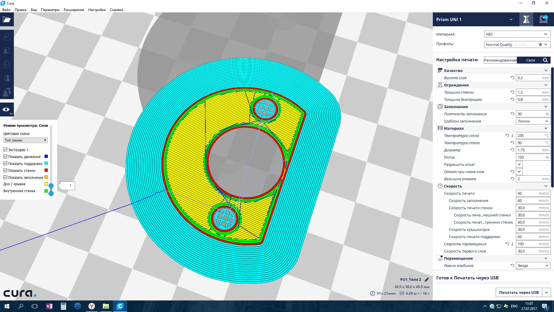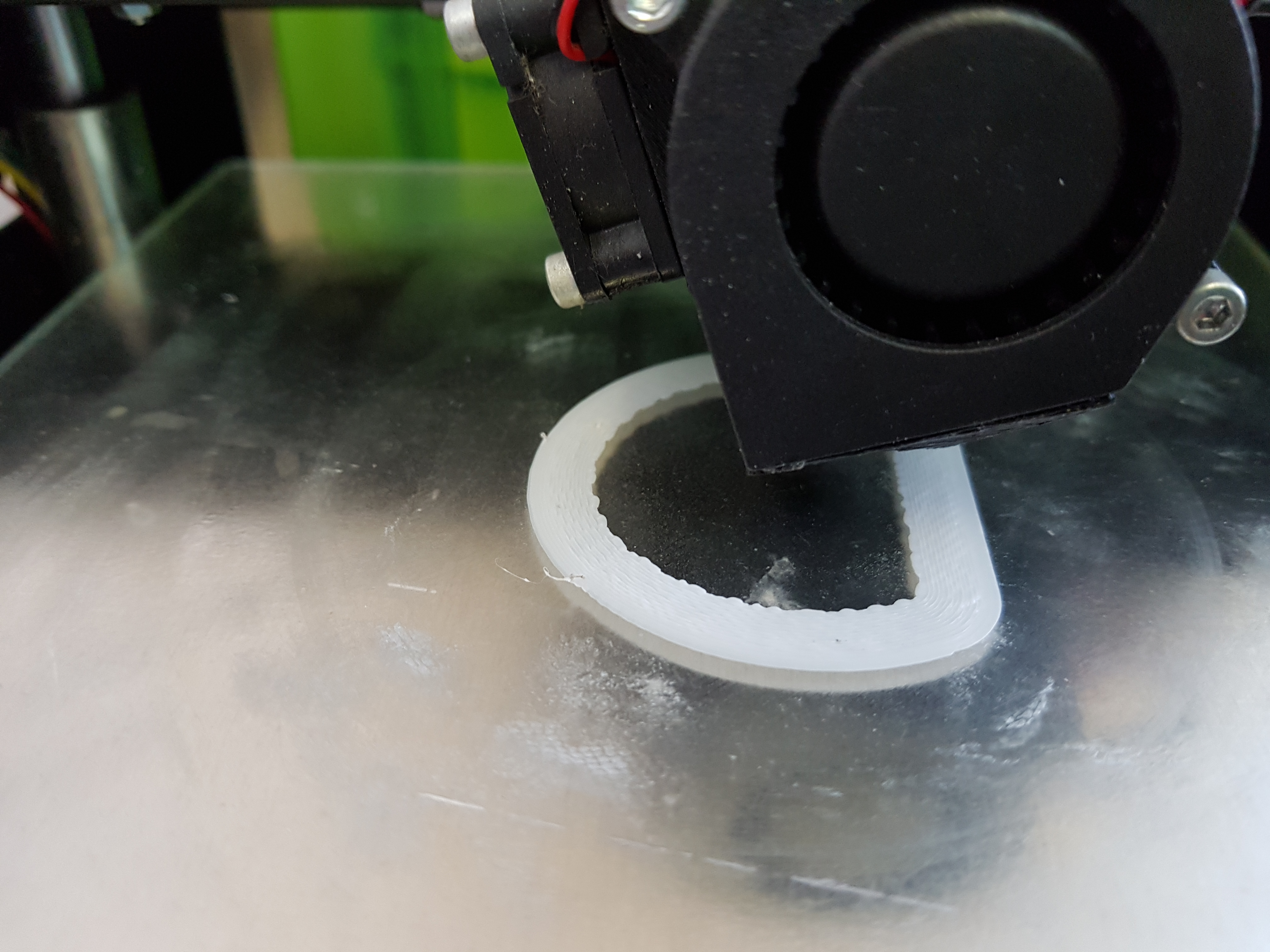 При печати АБС пластиком первого слоя возникает проблема неровного наложения нитей. Первые 3 - 4 нитки на кайме печатаются ровно, а потом начинается кривая нитка. На втором и последующих слоях пропадает. Стол ровный, бугров нет. От модели не зависит, на любой детали проявляется.