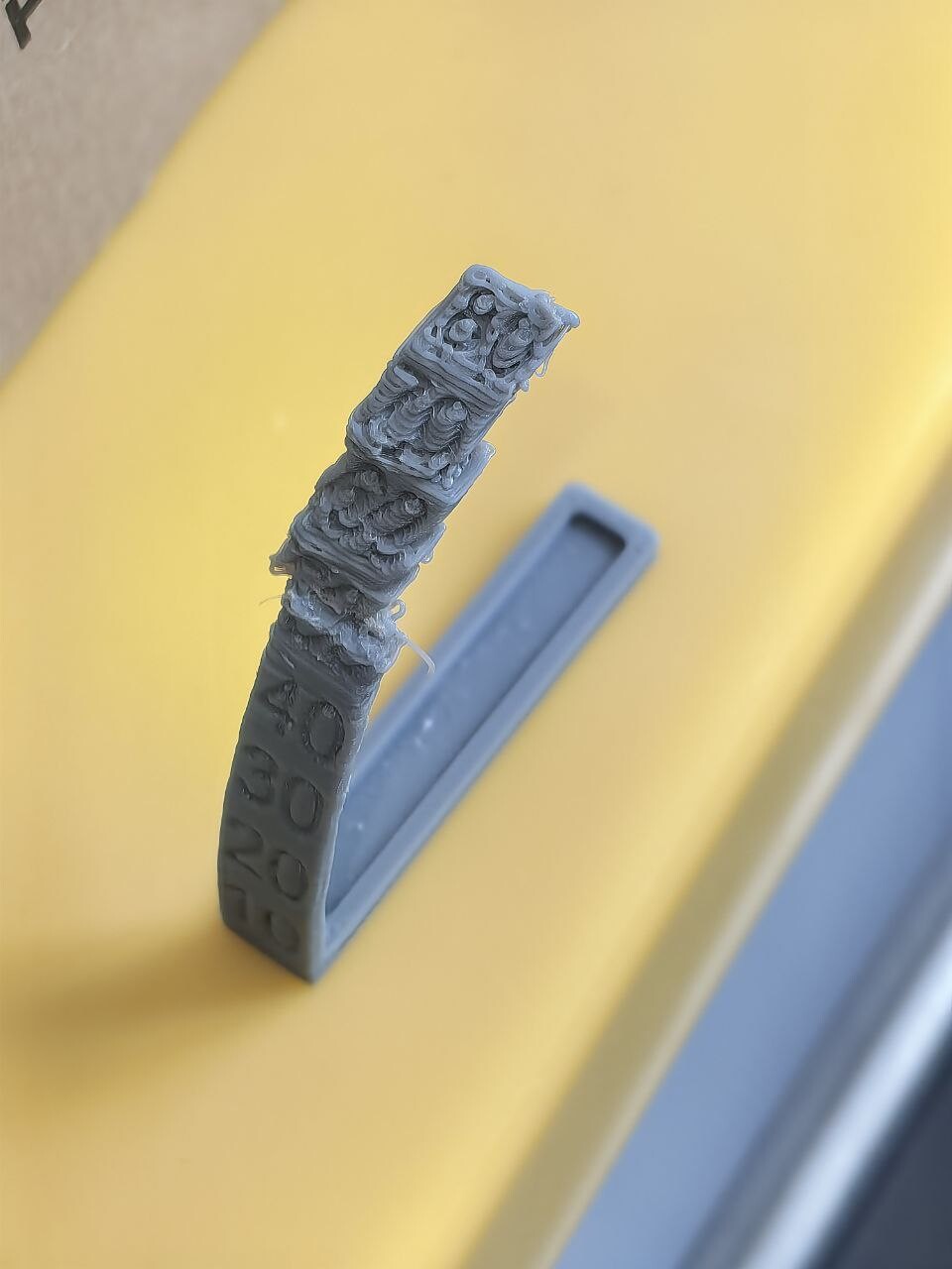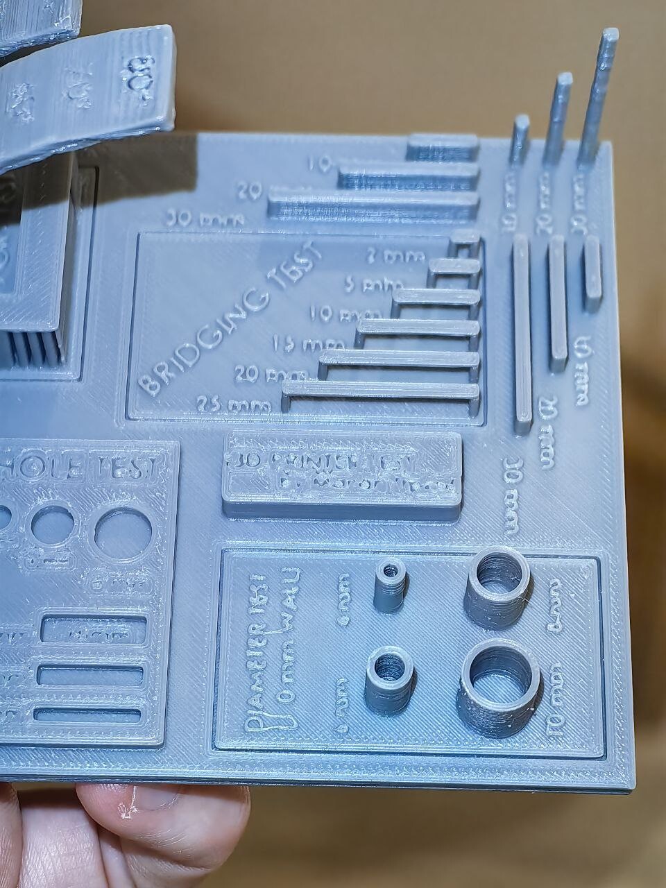 фото 1-2: ABS, экструдер 245, скорость 30-60, обдув отключен, на нависаниях 20%, коэфф. потока 1. Насколько я понимаю, слишком большой поток поставил, поэтому надписи все заплыли. Но в чем проблема нависаний я не знаю, т.к. тест мостов пройден идеально.