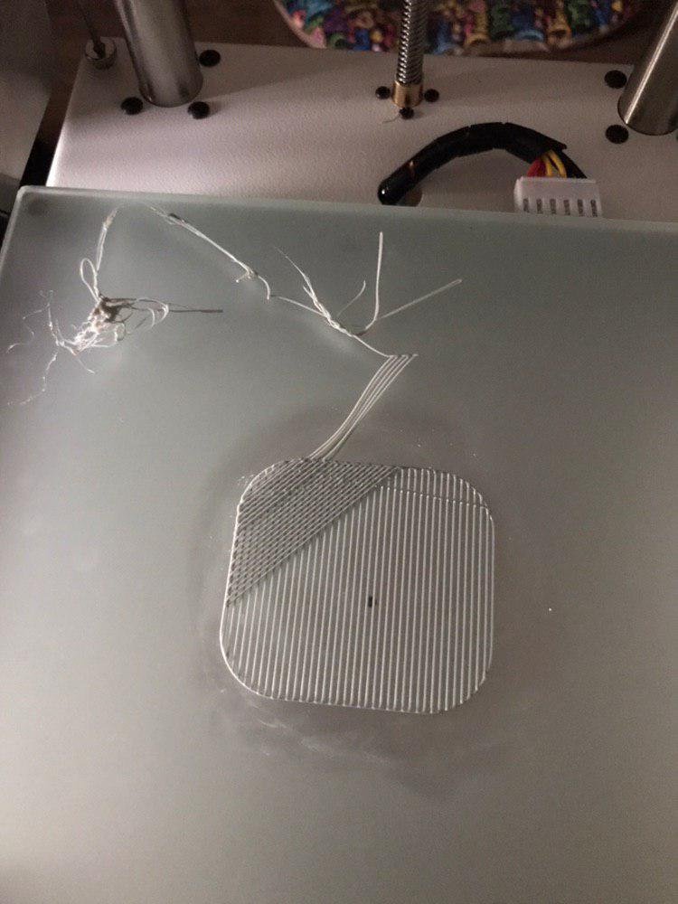 Реши попробовать печатать на подложке (raft вроде). Так красиво он мне давай этот рафт печатать, но на втором слое рафта теряет координацию и начинает печатать в стороне и, соответственно, не на столе, а в воздухе:Причем пробовал это дважды, ситуация один в один.