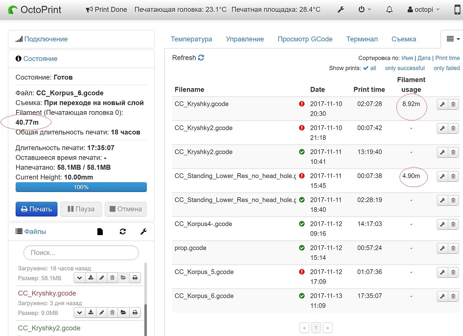 Octoprint, История не пишет флину и объем филамента