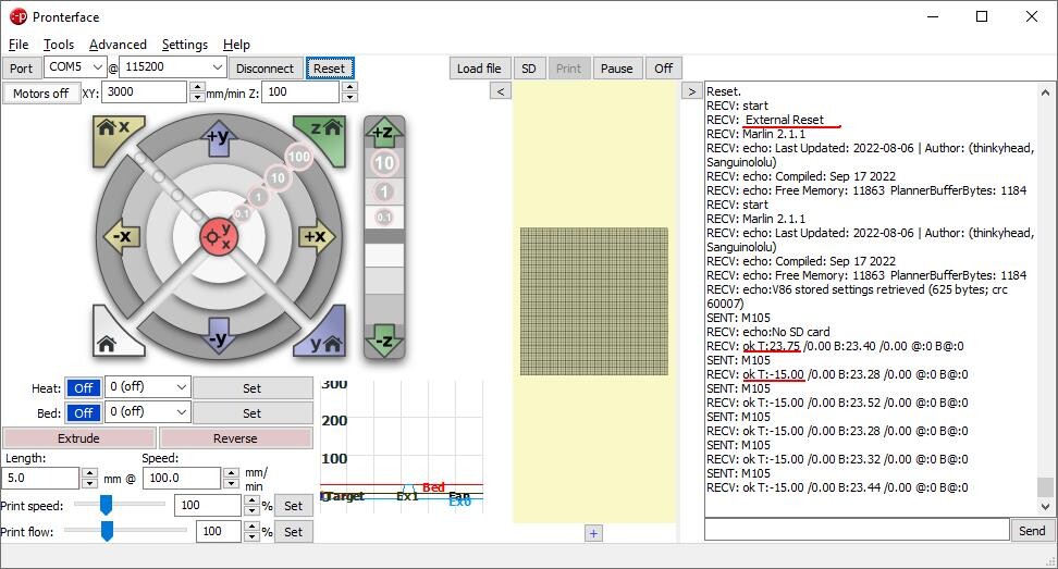 После сброса с опросом M105 первый раз температура правильная, а потом -15....Подключали несколько термисторов (заведомо исправных) 100к, провода тестором прозванивали - все хорошо. В прошивке указан первый тип термистора как и на столе. Стол показывает правильную температуру.