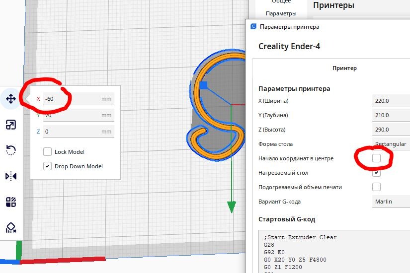 Отрицательные координаты при расположении модели на столе в Cura