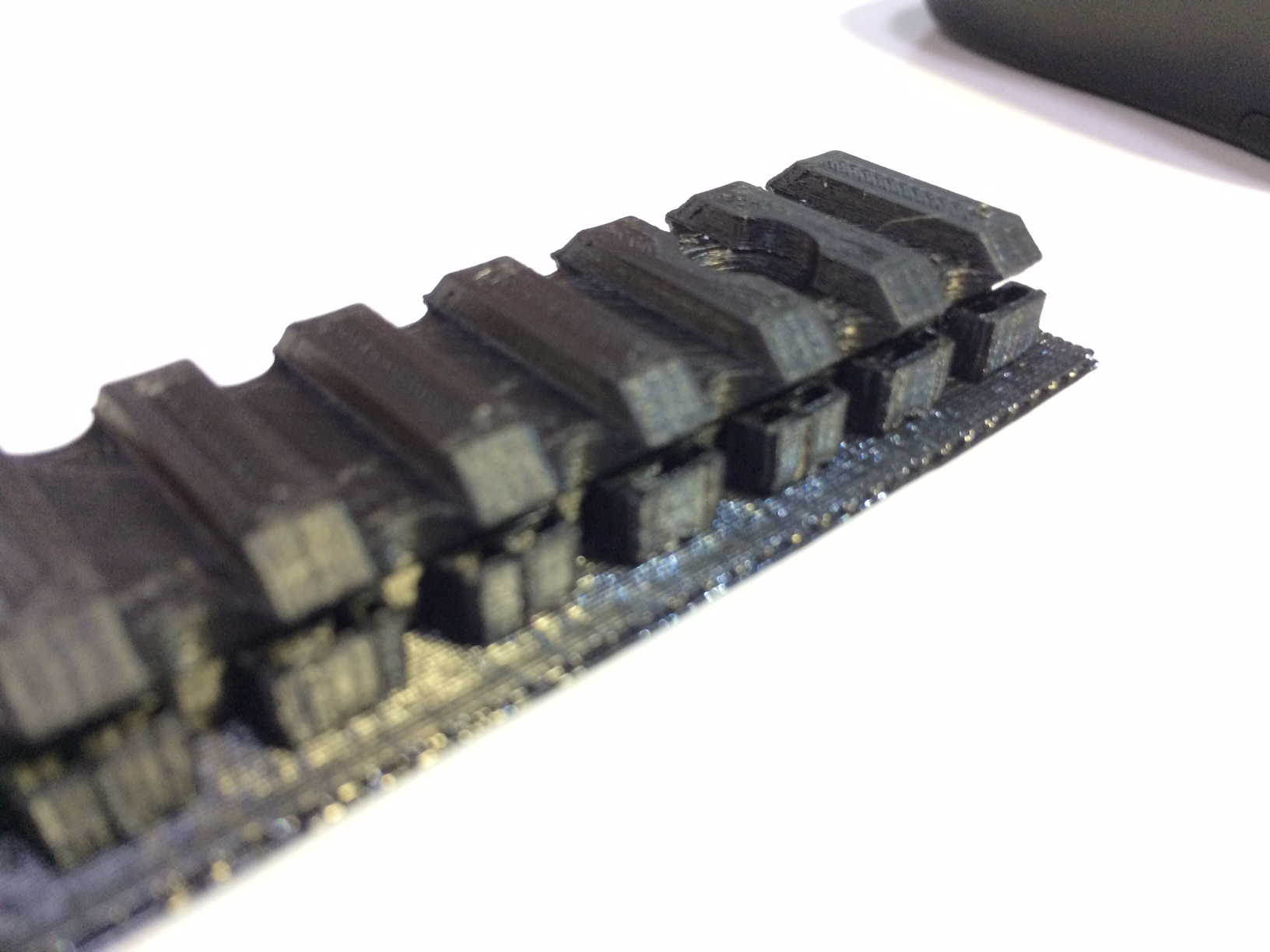 Принтер Prusa I3, Gcode формирую в Cura 15.04.6 c поддержкой. Распечатываю планку пикатини, в итоге распечаталось нормально, но что-то не понятное с поддержкой. Она напечатана ровно до начала печати свисания части детали.