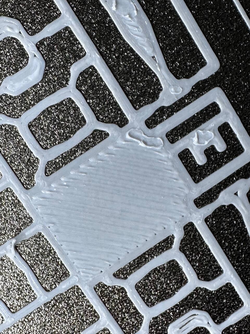 Подскажите, пожалуйста, при печати первого слоя получаются такие косяки. Недавно в печати, поэтому не до конца разобрался с настройками. Что и куда подкрутить, чтобы избавиться от этого? PLA+. Менял настройки экструзии, может ли из-за них такое быть?