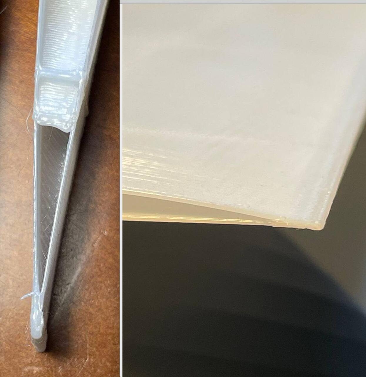 На kp3s все хорошо (справа) , а на kingroon pro v2 "кеся-меся" (слева). Менял поток, менял температуру, откат. Не получается избавиться от этого деффекта.Одинаковый gcode. Не могу установить проблему. Подскажите, на какие параметры обратить внимание?Пластик PLA+