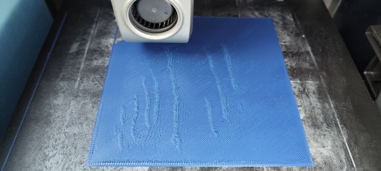 Всем привет! При печати первого слоя появляются какие то задиры, при этом когда сопло проходит место задира слышно как что то шаркает. Стол ровнял металлическим скотчем, результат на фота, как я понимаю более менее нормально.