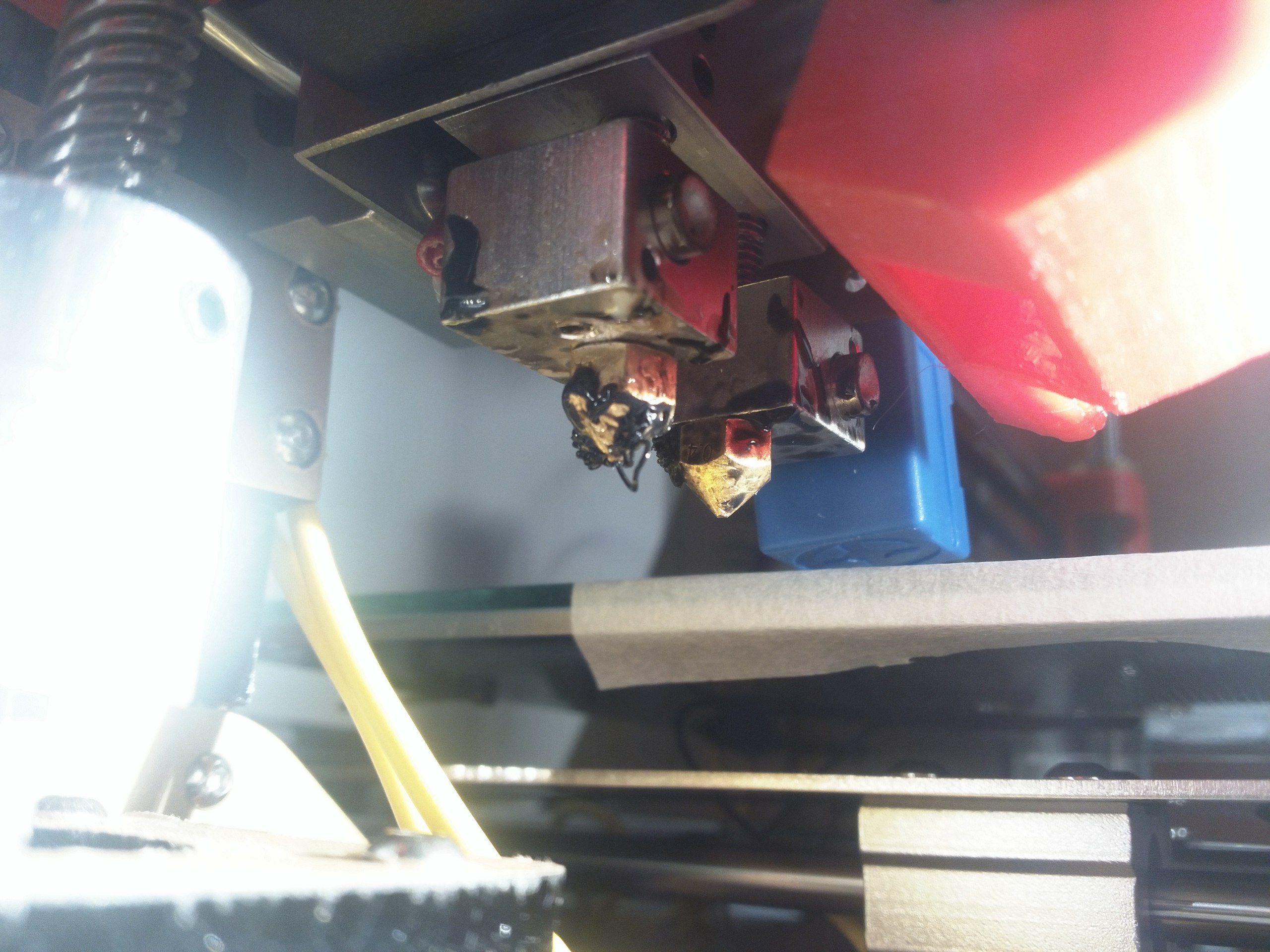 Пластик попросту не прилипает к столу. Пару удачных раз я почти случайно умудрялся отрегулировать стол, но после боевого молотка и переносок принтера везение закончилось. Вопрос платиновый, даже не спорю - Как максимально отрегулировать стол? Пробовал любимые методы с бумагой - почти ничего, было два исхода: слишком высоко, пластик просто оставался на экструдере (как на картинке, но в пропорционально больших масштабах), либо настолько низко, что второй экструдер умудрялся сдирать только что напечатанную линию. Из материалов на данный момент есть белый малярный скотч (синий в пути), стеклянный стол и несколько килограмм PLA пластика.