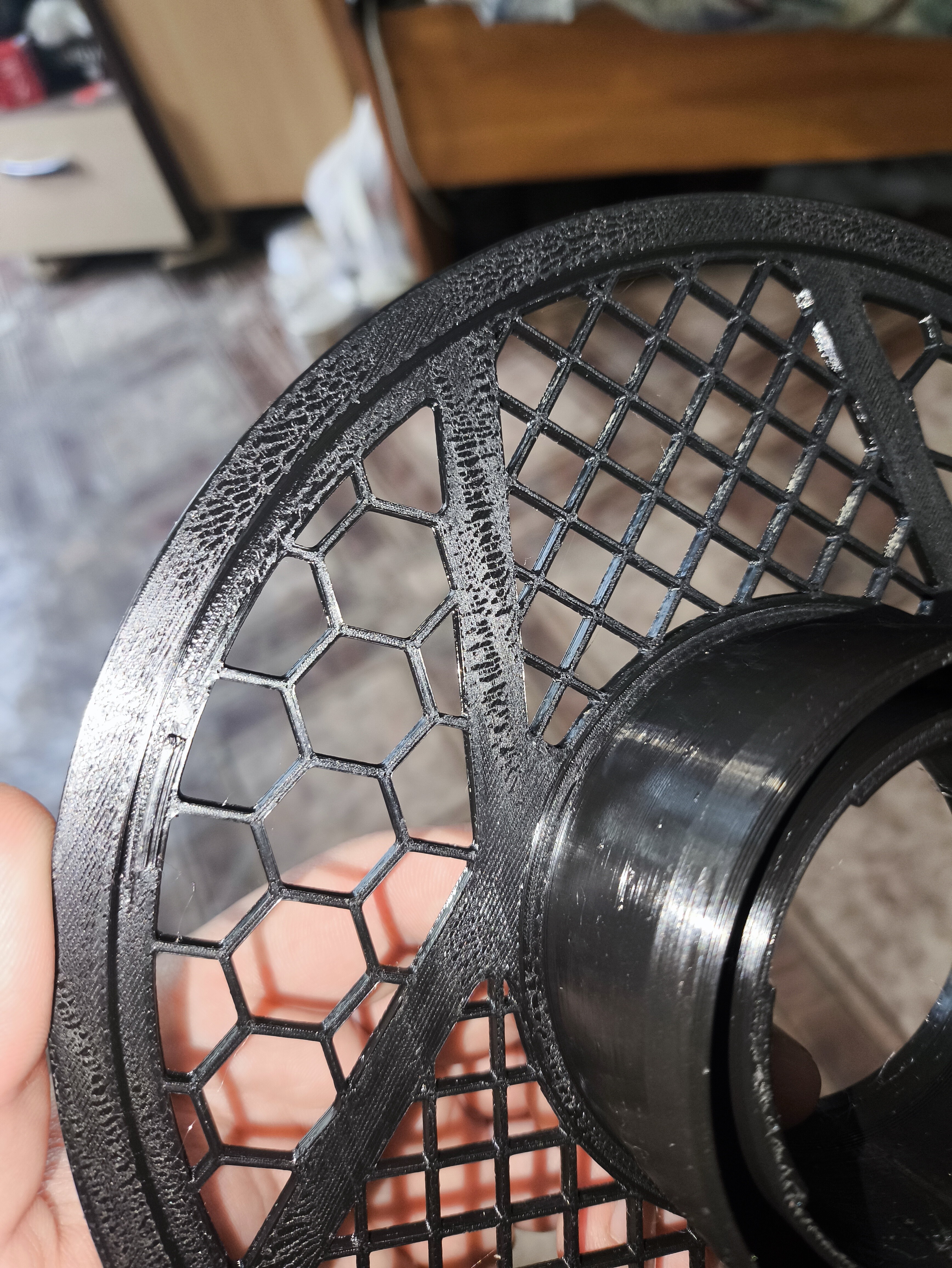 Поскажите пожалуйста с чем может быть связанно такое экструдирование. По началу печатает нормально но потом в некоторых слоях начинает так печатать