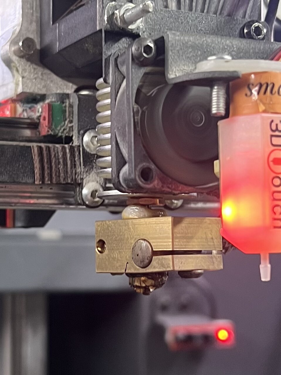Поменяла сопло, после того как предыдущее забилось. При принудительном выдавливании пластика - все ок, когда начинается печать, то пластика выходит мало, полноценная линия не образуется. И пластик скапливается между радиатором и нагревательным блоком. Также при печати шестеренка издает хруст. Подскажите в чем может быть проблема?