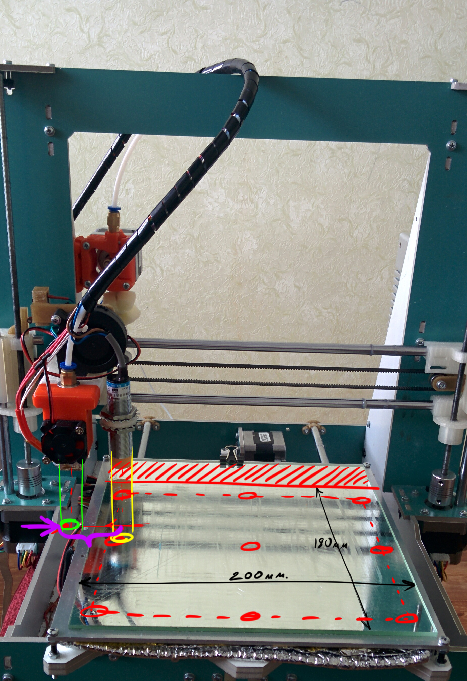 Плохо видно, но сам экструдер находится за пределами стола, на расстоянии 25 мм до стекла. Ни как не могу заставить его печатать в центре стола. Вот мои настройки: