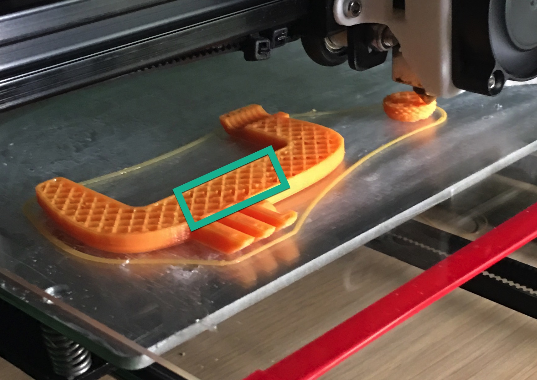 Почему то именно в этом месте начинает 'буксовать' головка которая проталкивает филамент, на всех остальных местах - все отлично. Уже не раз замечал, что именно при заполнении решеткой, в некоторых местах только начинает такое делать. То что рядом лежит кружок - там такого не происходит.