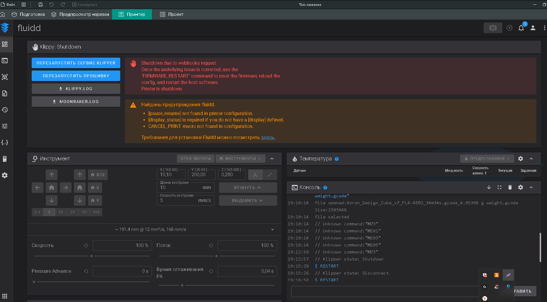 Почти собрав все в кучу и почти настроив все, столкнулся с проблемой начала первой печати. Принтер калибруется, ездит,паркуется, нагревает и выдавливает пластик. Но произошла проблема. Как я только загружаю файо для печати и после того как принтер разогреется. он начинает очень сильно опускать нагревающую кровать и начинает уводить в сторону эктрудер до тех пор пока не сталкивается с рамой и не начинает трещать. Использую OrcaSlicer. Подскажите пожалуйста, с чем это связано? И как это можно решить?
