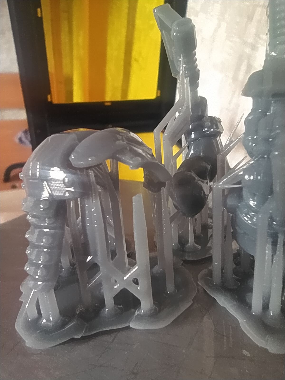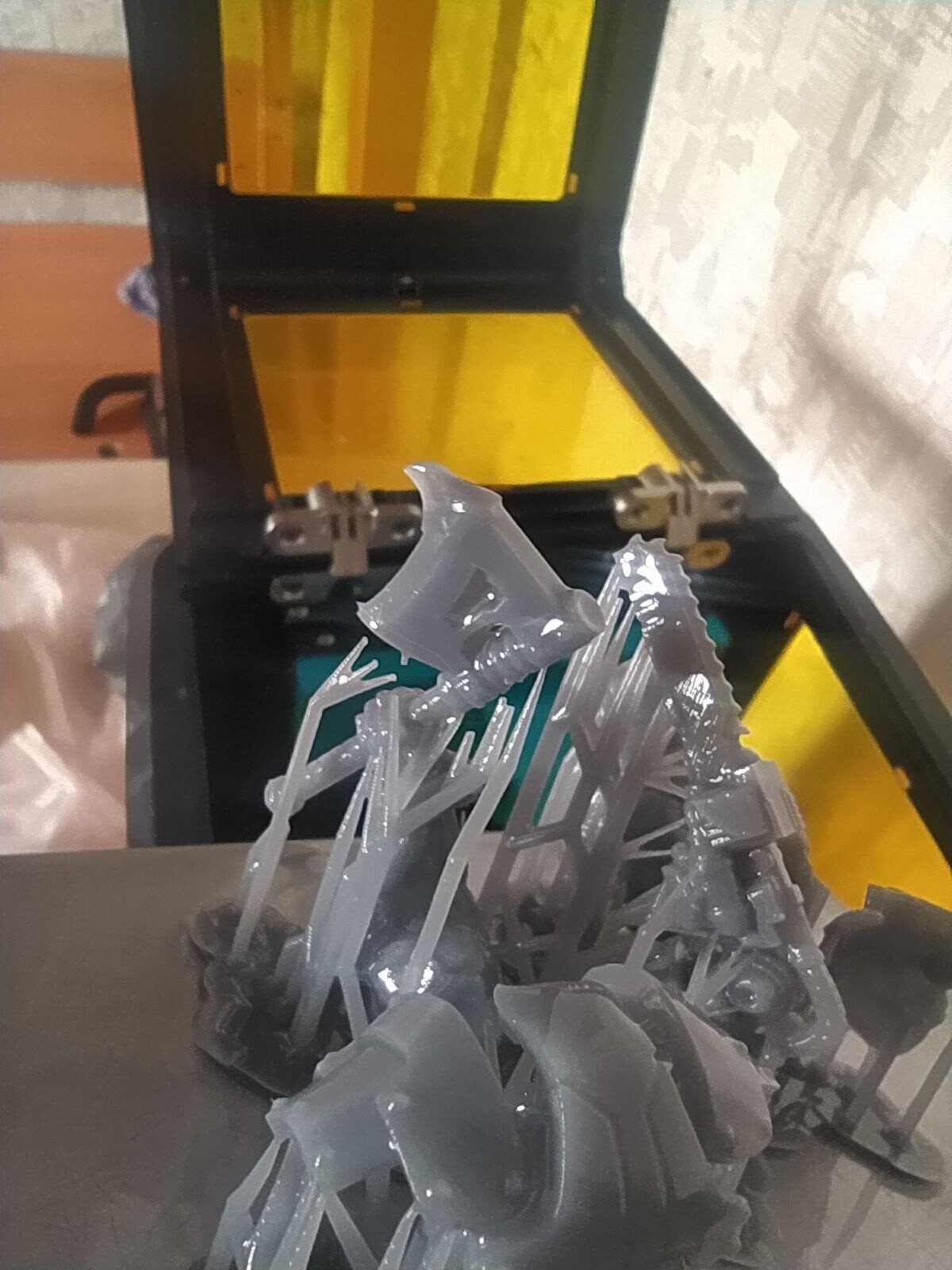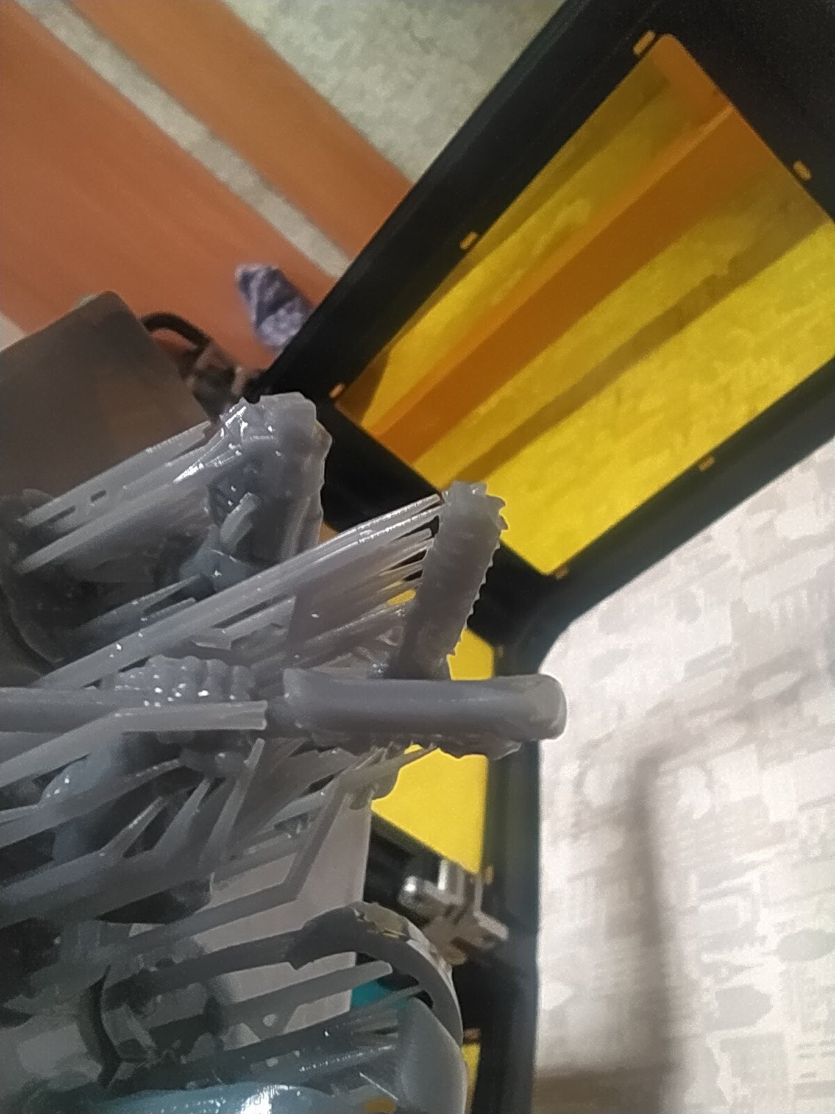 Подскажите что не так. По не зависящим от меня причинам был перерыв в печати. Принтер несколько месяцев стоял в коробке в чулане. Решил снова вернуться к хобби и появился повторяемый брак. Всё подготовил, отъюстировал как обычно. Принтер Anycubic Photon S, слайсер LycheeSlicer, настройки базовые. смола Anycubic Basic Grey (UV wavelength 405mm).Вот пример брака, концы поддержек не пропечатываются.