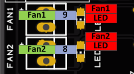 Нашёл в Марлине в конфиге платы, что пины определены как FAN0_PIN - 9 и FAN1_PIN - 8