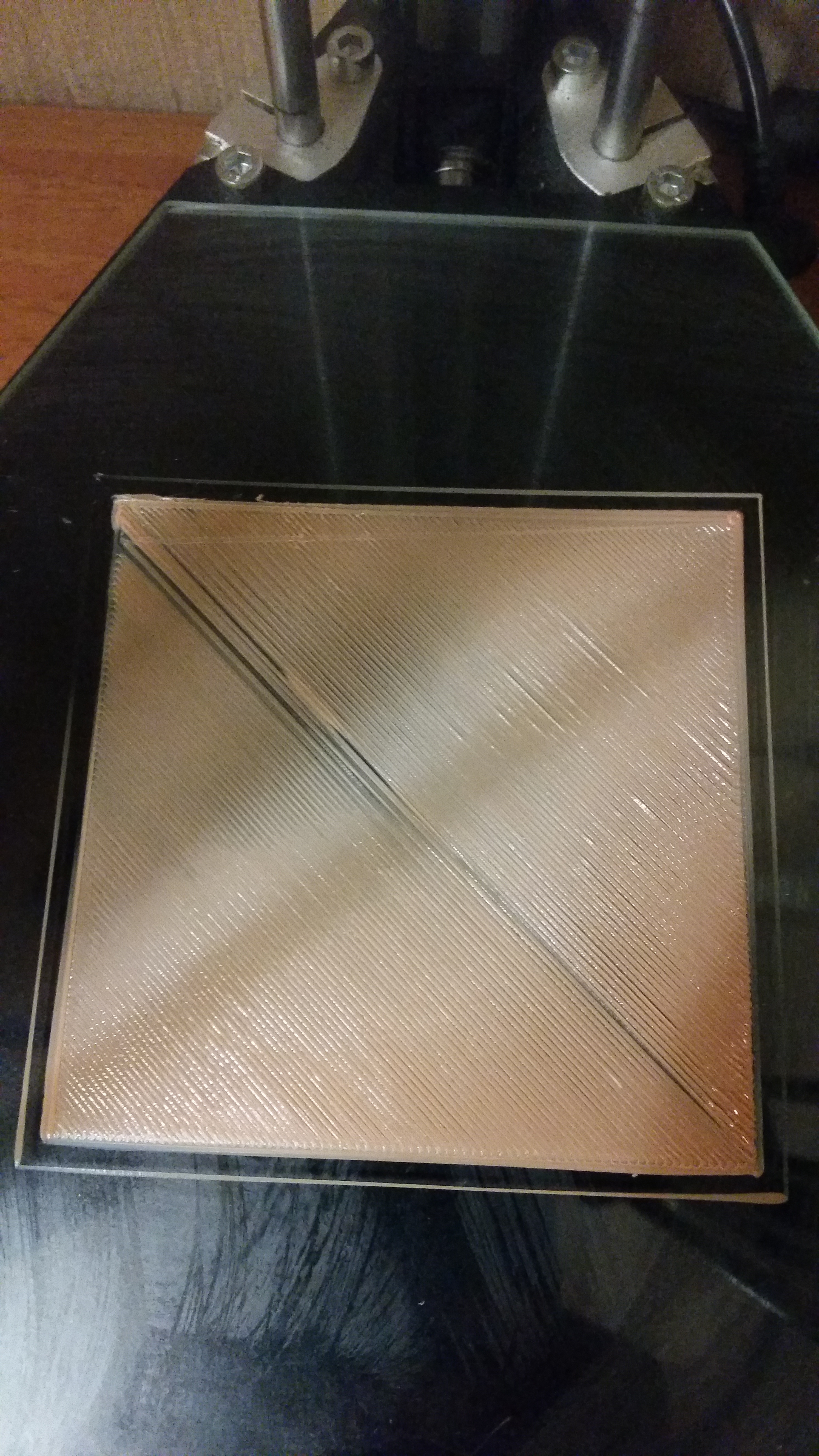 Принтер откалиброван, высота выставлена, температура выставлена, стекло очищено и покрыто лаком. Проблема возникает при печати относительно больших моделей (на фото сторона квадрата 9,8 см).