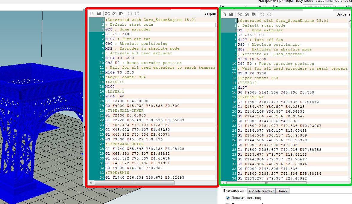 Генерирую код в Repetier-Host 1.6 (в версии 1.5.2 проблема такая же) через CuraEngin. При внесении изменения в настройки (высота первого слоя с 0.300 на 0.100) код совершенно меняется и выходит какая-то катавасия. Я не могу понять в чем причина. В добавленном изображении Хороший код - Зеленый, Плохой код- КрасныйИ второй вопрос. При выполнении 16й строки из 'зеленого' кода. Экструдер не опускается на заданную высоту (Z0.300) а продолжает печатать на высоте Z15. Приходиться дописывать еще одну строчку (между 15й и 16й) G0 Z0.300. Но чувствую что это что-то нездоровое.