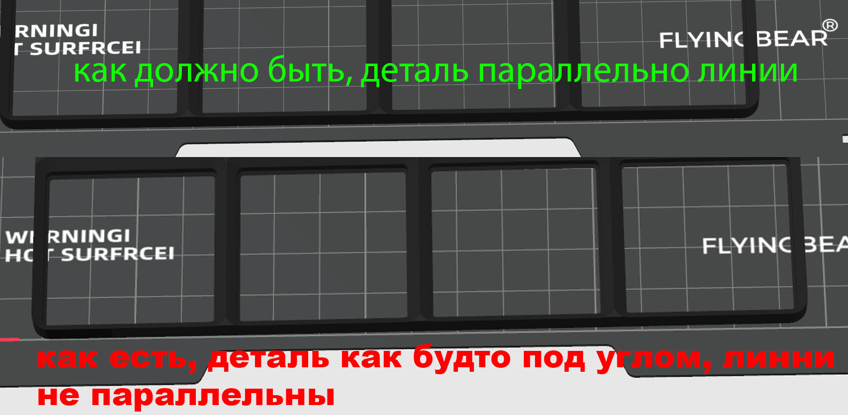 Недавно купил себе первый принтер, им стал flyingbear S1.Первое время не было никаких проблем, печатал в основном мелочь, однако когда попытался распечатать что-то большое появилась проблема. При печати икеевских (вроде) пластин Gridfinity размером почти на весь стол увидел что она печатается под углом, хотя в орке все стояло ровно.для примера фото ниже: