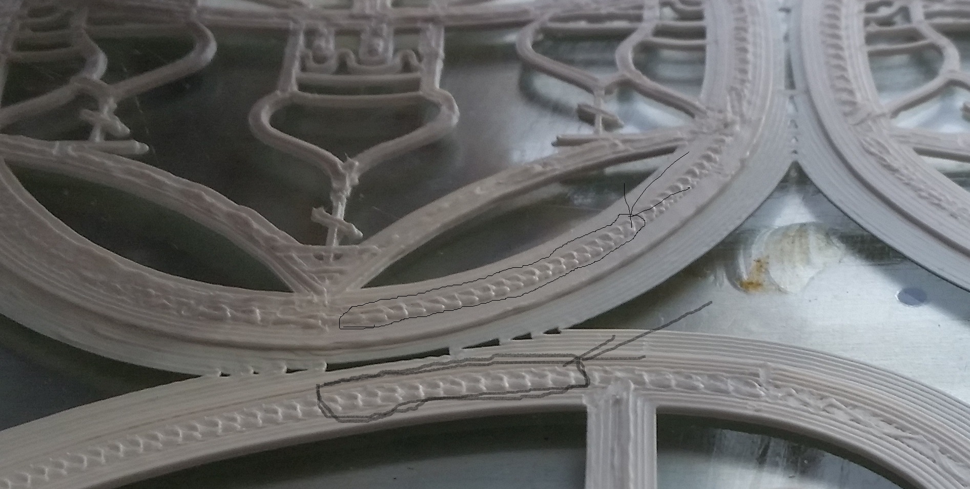 Подскажите пожалуйста кто в курсе даже не знаю как объяснить. В общем на рисунке отмечены области которые с каждым слоем становятся все выше и выше. Заполнение внутри фигуры, такое ощущение, что перебарщивает с пластиком. Высота внутреннего слоя выше чем внешнего и с каждым новым слоем все выше и выше в результате деформируется деталь. Как то так не могу лучше объяснить с какими настройками поиграться куда глядеть ???