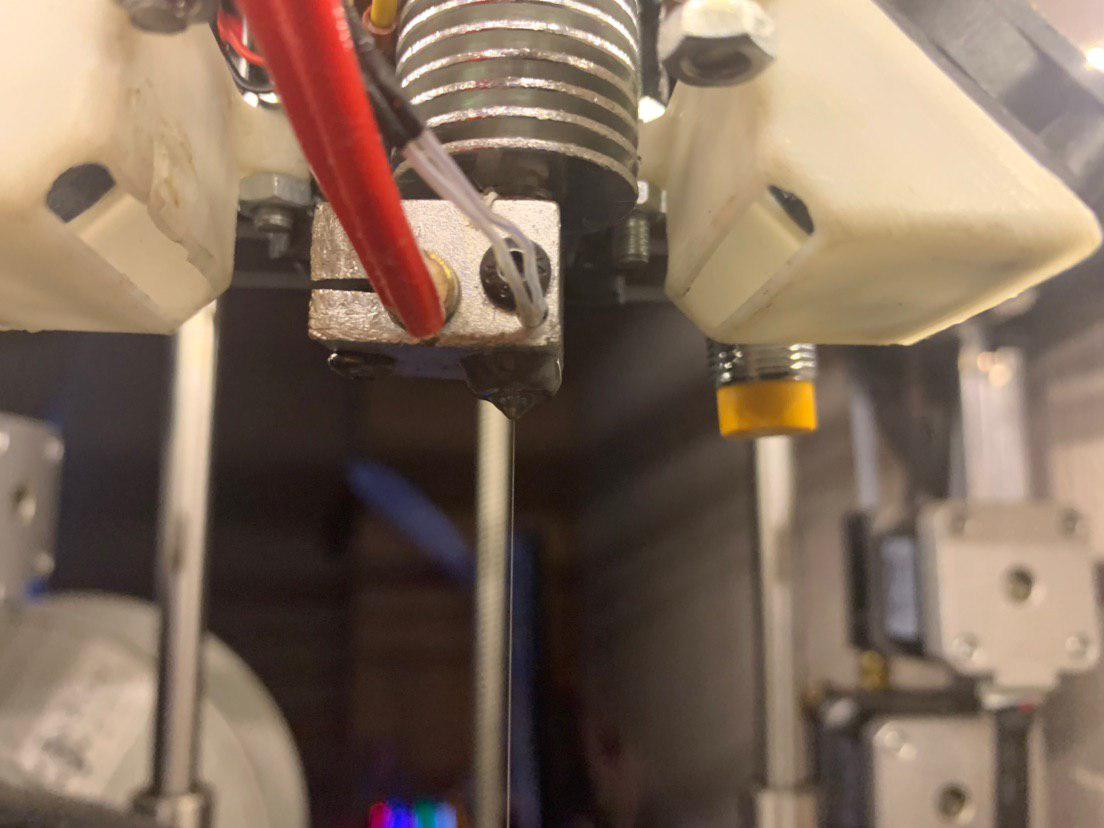 При печати возникает вот такая проблема: Пластик, судя по всему, плавится и протекает между резьбой сопла и хот-энда и со временем начинает капать большими каплями на печатаемую фигурку.