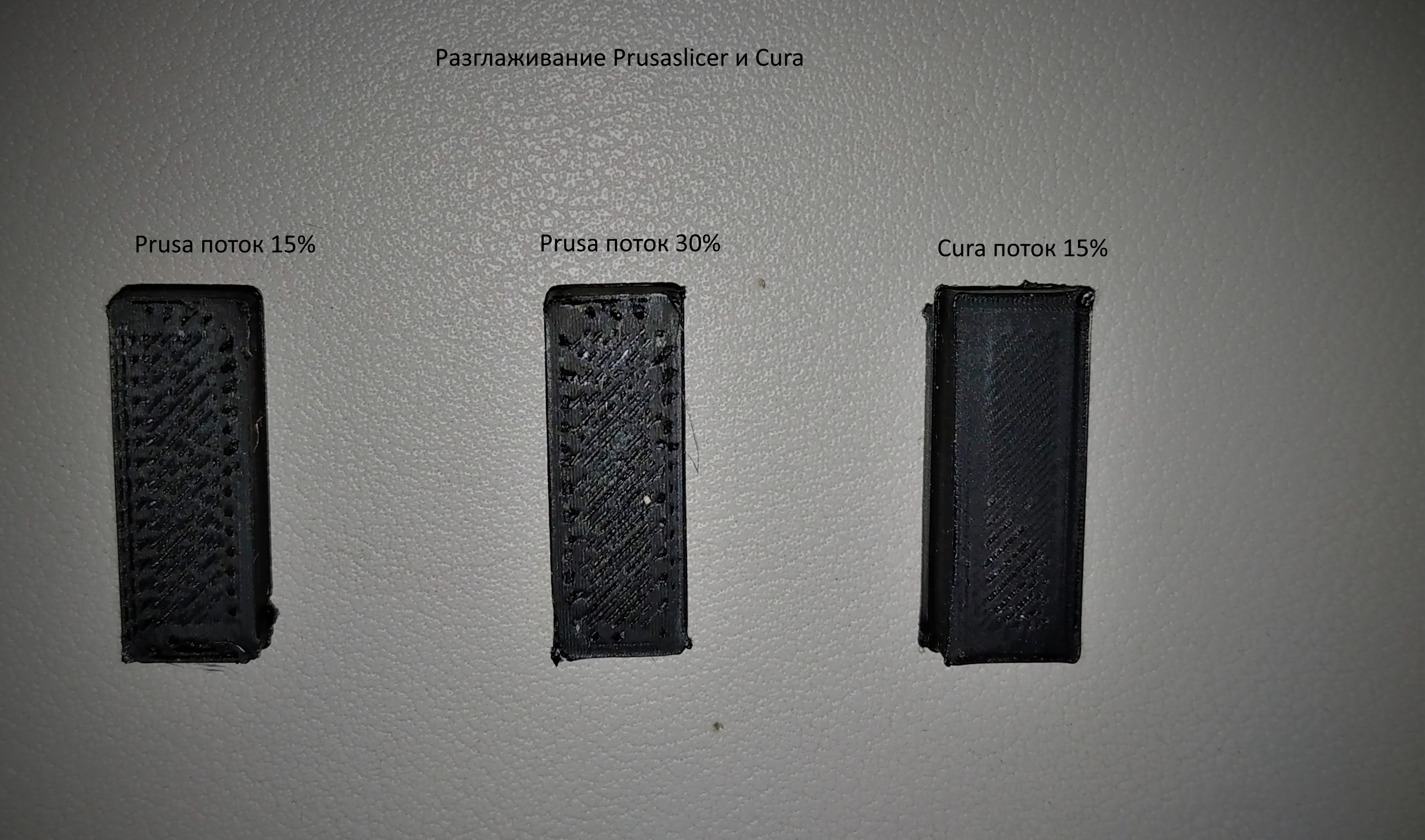 Доброго времени сообществу!) Столкнулся с некой странностью - после изменений профиля (не затрагивающего разглаживание!) в Prusasliser`е перестало работать разглаживание, точнее его просто нет. Были ПОЛНОСТЬЮ удалёны все профили (папка в Roaming) и созданы заново, все параметры взяты из предыдущей, рабочей конфигурации. Само разглаживание настроено так: Разглаживание - Вкл., Тип разглаживания - Самая верхняя поверхность, Поток 15% (взял по умолчанию, хотя раньше делал 10-12%), Расстояние между линиями - 0.1 мм. Однако поверхность детали выглядит как-будто режим вообще не включен, а изменение величины потока - практически не даёт разницы . Но в G-code процедура ironing начинается с высоты заданной в параметрах заполнения и заканчивается на полной высоте детали. В Cure с аналогичными настройками была нарезана эта-же деталь и разглаживание вполне удовлетворительное. Я понимаю, что после не значит потому, но кроме перехода с Марлина на Клиппер ничего не менялось. Единственное что - в Klipper`e отсутствует [Firmware Retract], а в PrusaSlicer`e заблокированы ускорения, рывки и т.п., чтобы эти параметры брались из Клиппера.