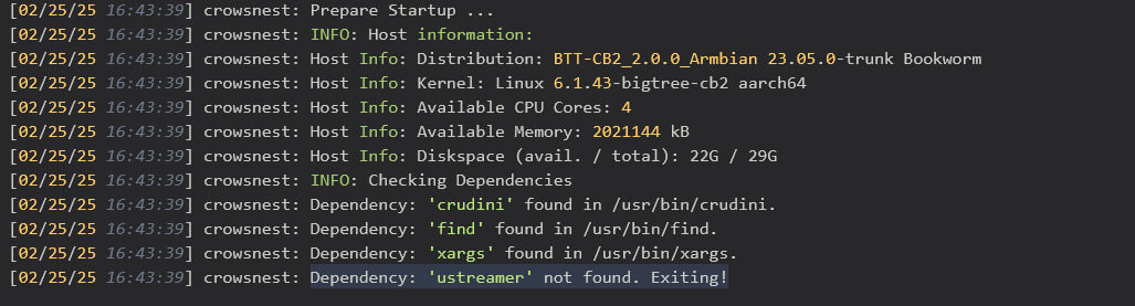 Добрый день, После обновления Klipper, перестала работать камера в веб-интерфейсе. Начал разбираться в итоге сломал полностью систему и пришлось все переустанавливать. Думал что после переустановки все само собой починится, но нет(. Посмотрел логи crowsnest, там пишется что нету 'ustreamer' not found. Что это такое? И как это исправить?