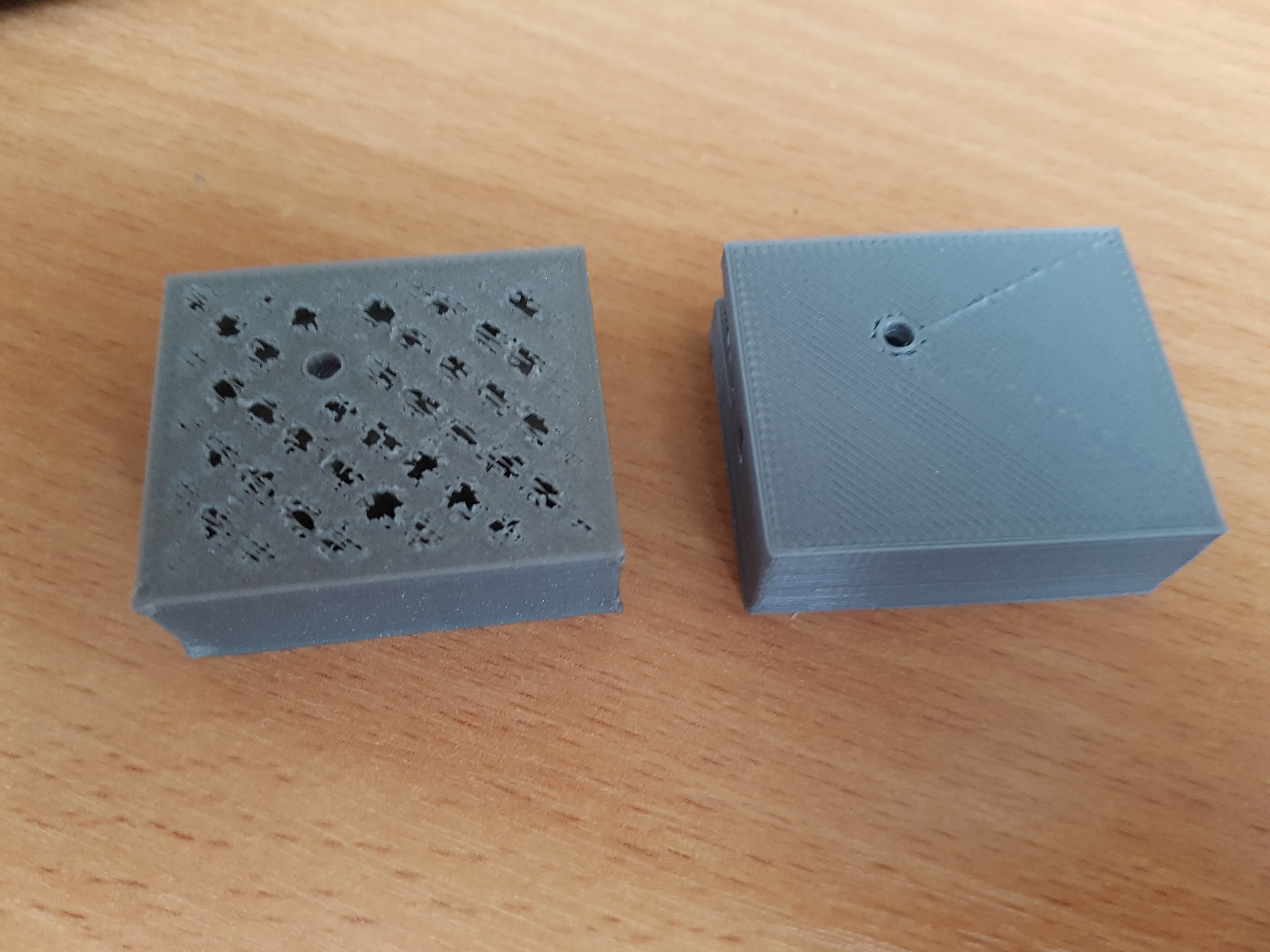 Печатал пластиком FD Plast Terminator и проблем с верхним слоем не было (см. деталь на фото справа), как только он закончился, то я вставил новую катушку FD Plast Terminator, правда он почему-то оказался другого цвета, но не важно, и напечатал ту же модель (см. деталь на фото слева). На детали появилась проблема с верхним слоем.