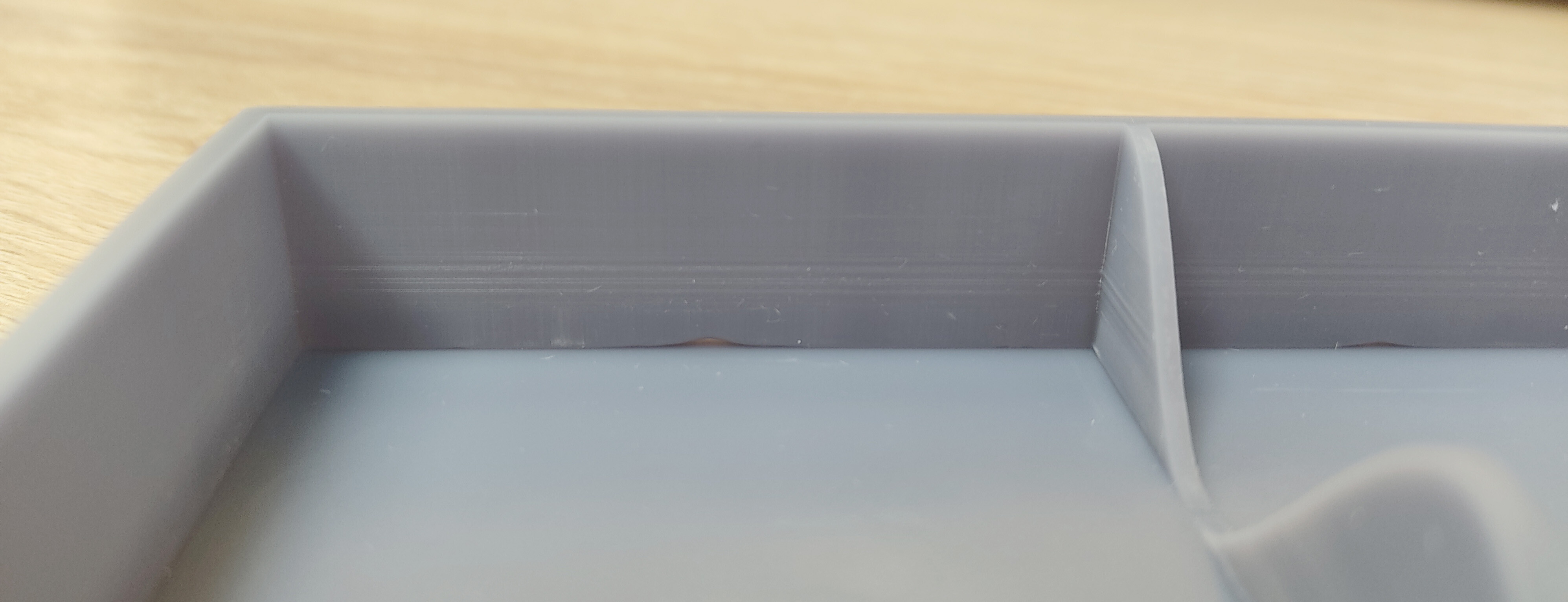 1. При печати обычной коробочки (12 см в длину) вначале присутствуют слои снаружи выглядящие рыхлыми и белёсыми, внутри нет. Так же на границе между дном и боковой стенкой видны дыры. Да и сами слои, если присмотреться немного "гуляют" из-за чего поверхность не гладкая.
