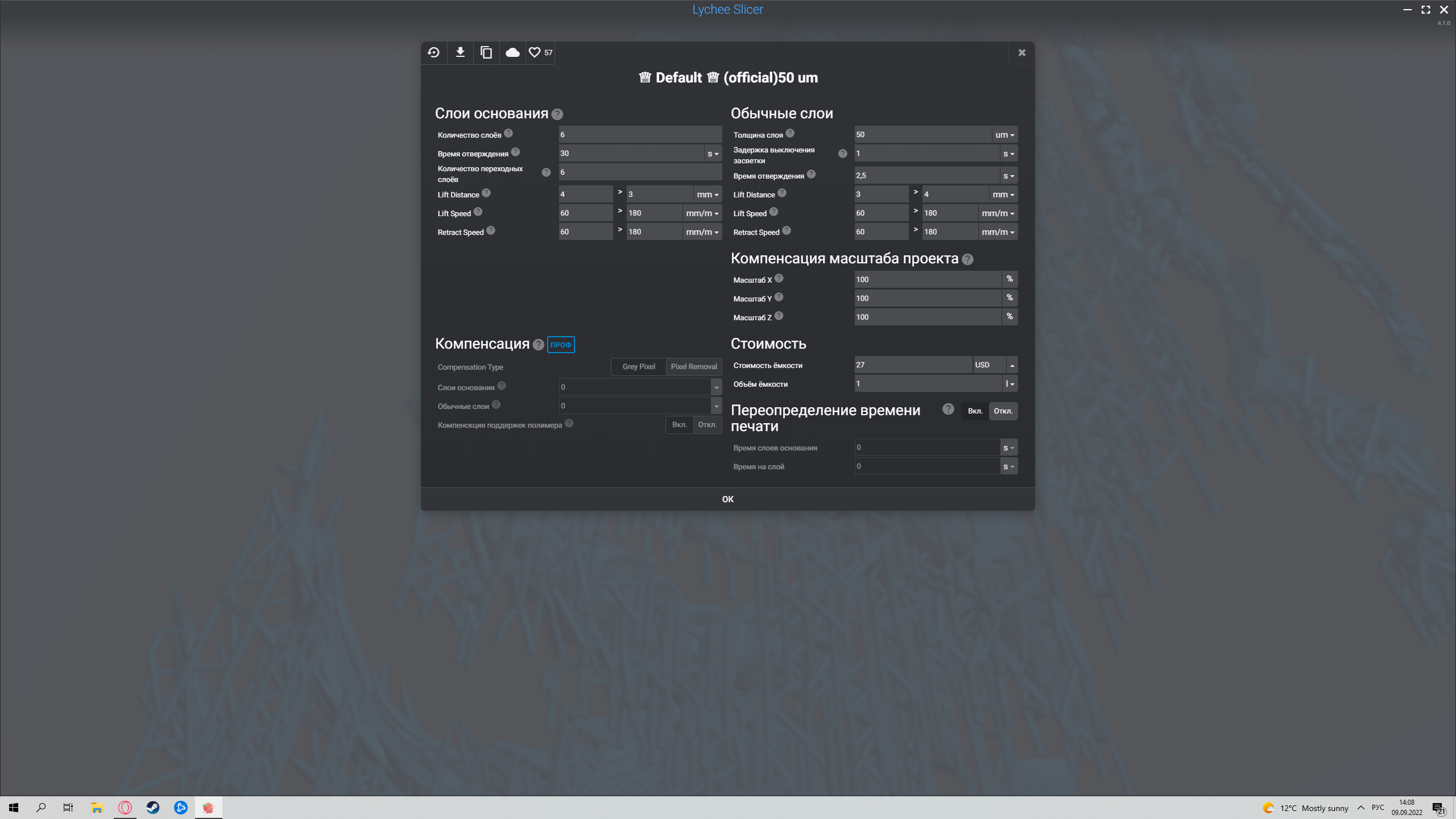 4. По возможности, пожалуйста, посоветуйте настройки для печати. В данный момент вот такие. Это стандартные настройки слайсера.