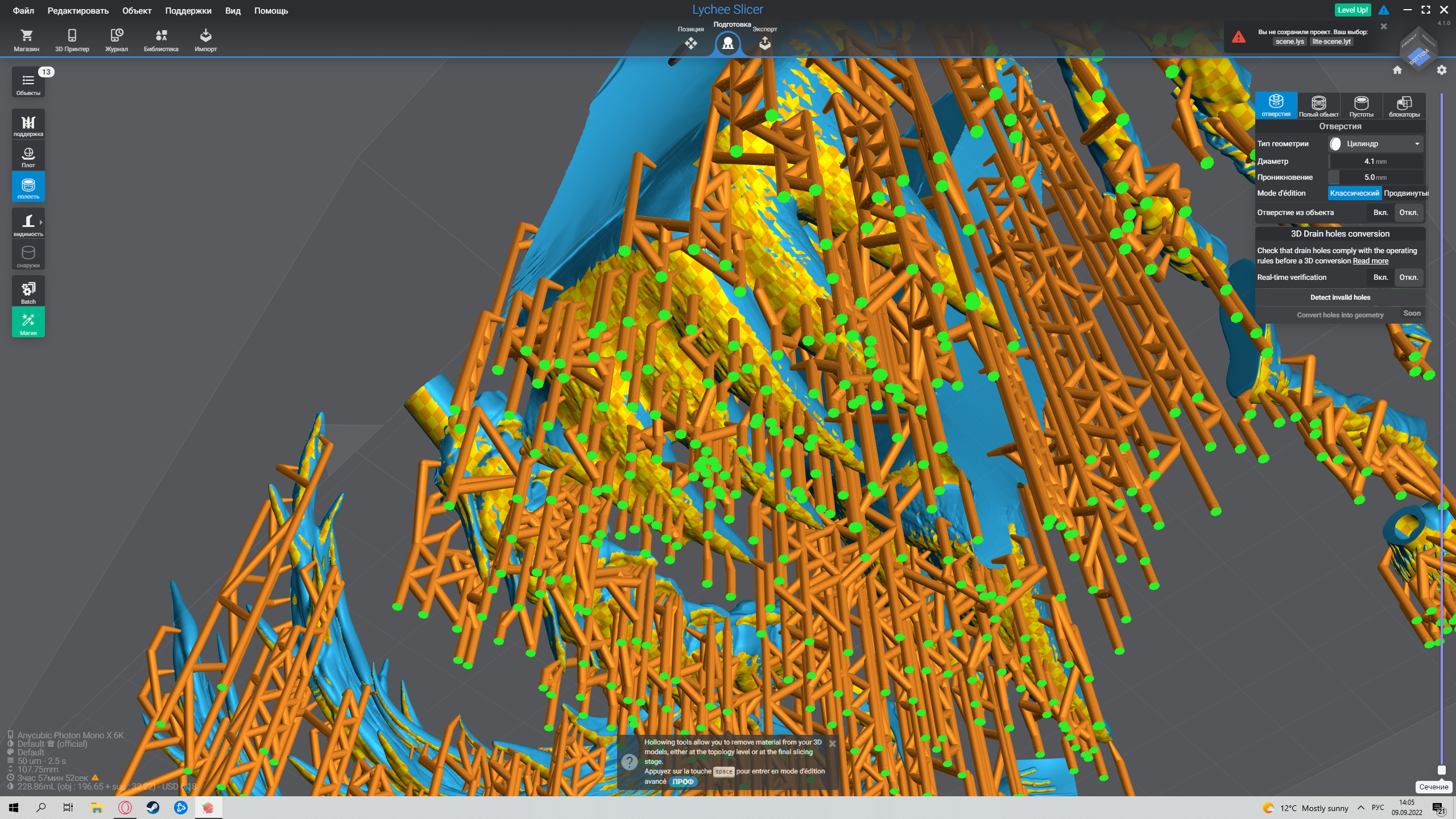 1. Использую Lychee Slicer, при подготовке модели к печати на ней отображаются цветные участки, как на картинке ниже. Что это и как от этого избавиться?