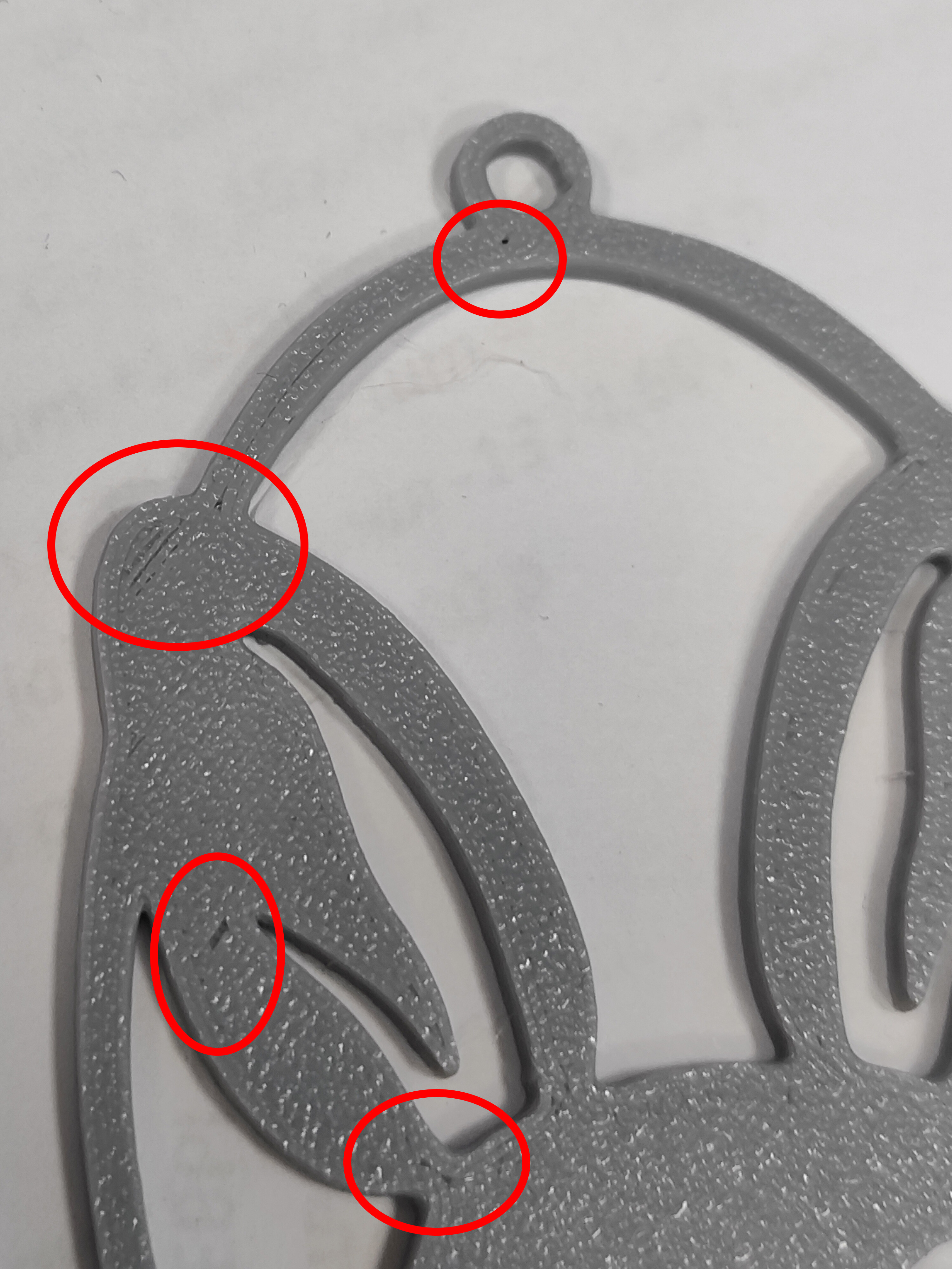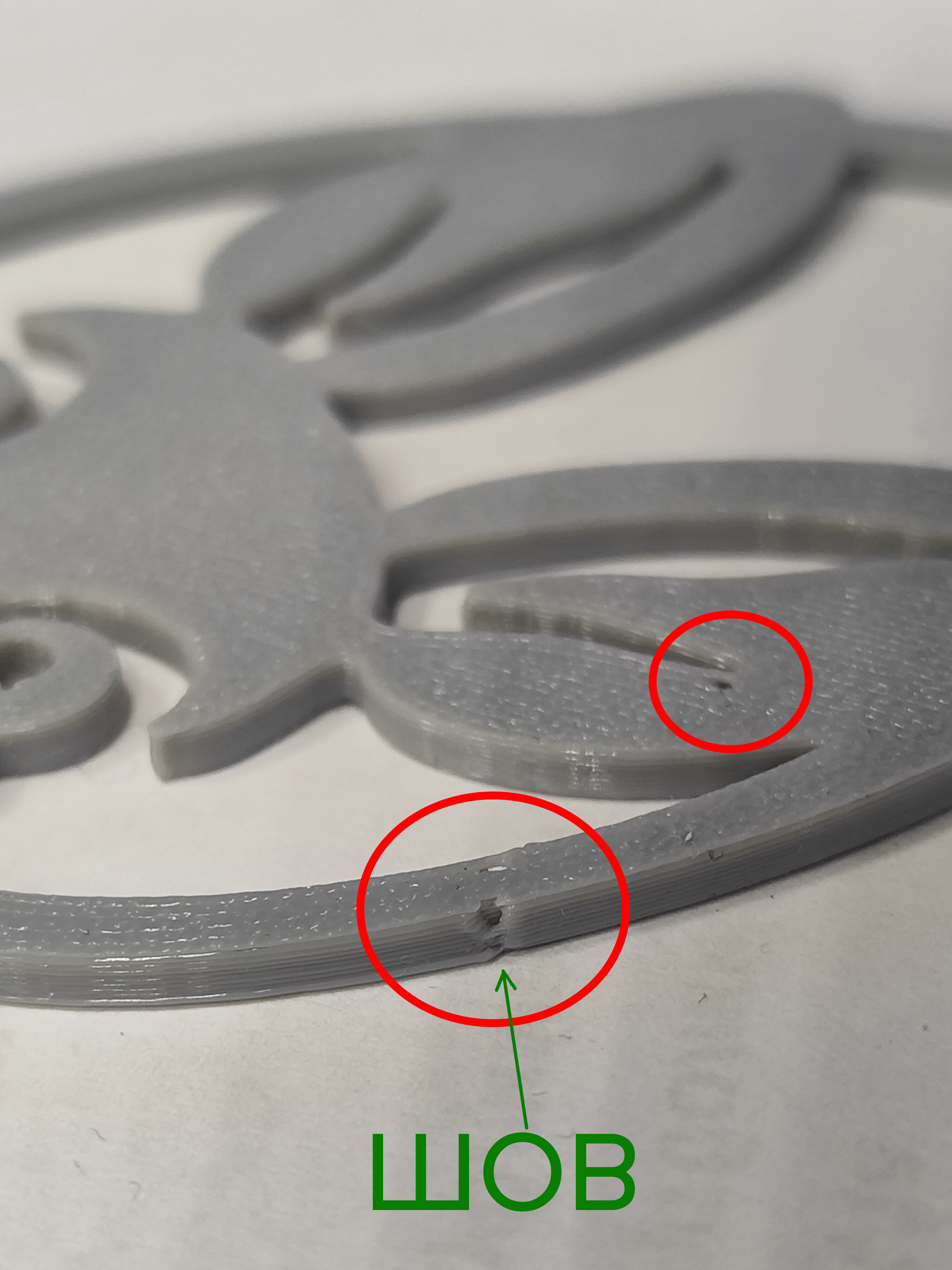 На третьем и четвёртом фото отметил шов. Вот он разорванный, как будто из-за того, что пластик не сразу стартует из сопла (было в первом вопросе). м?