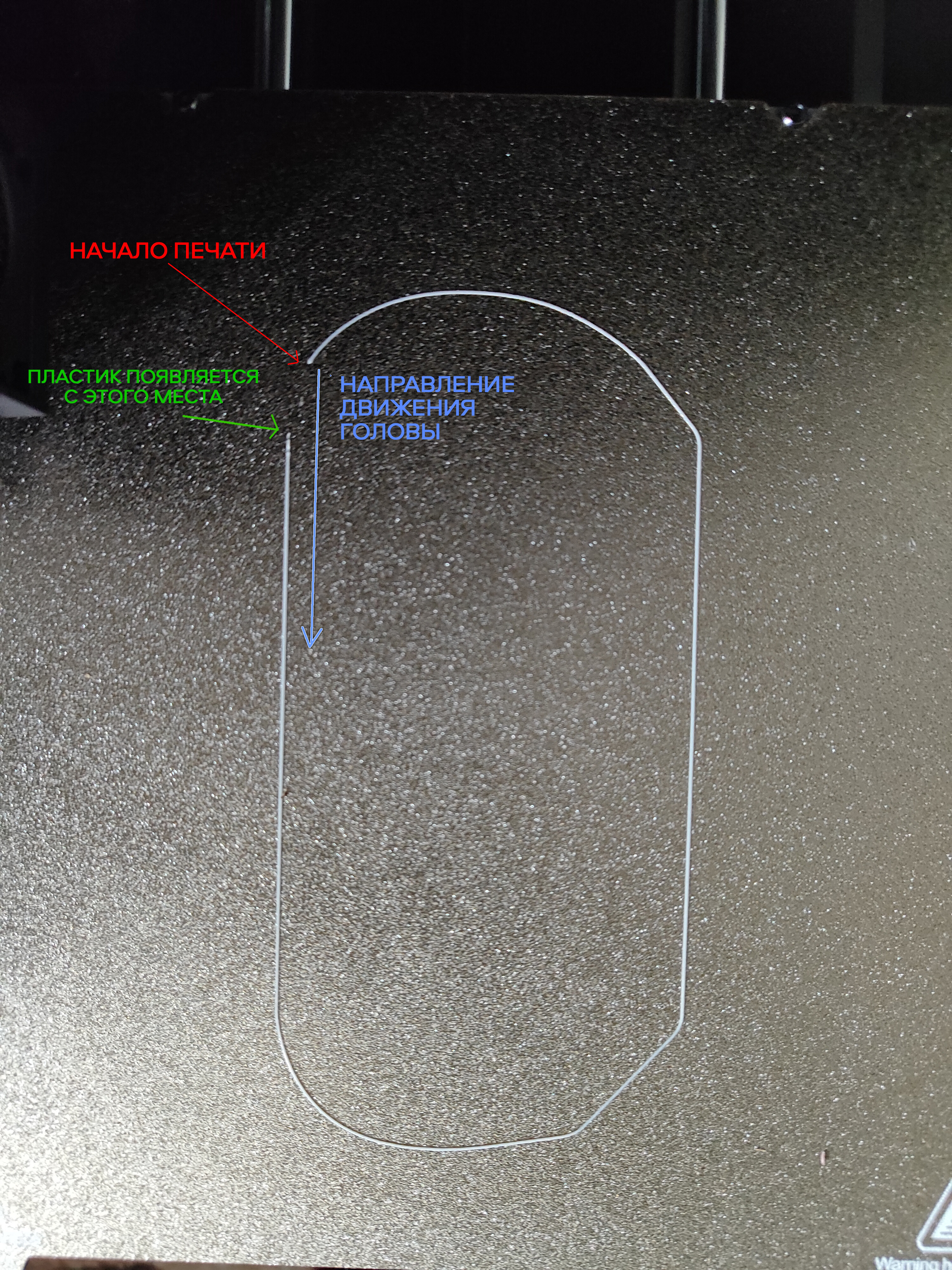 1.) Принтер печатает полосу по краю стола т.е. как бы прогоняет пластик, затем голова едет к началу печати и печатать начинает воздухом, а пластик начинает выходить позже.