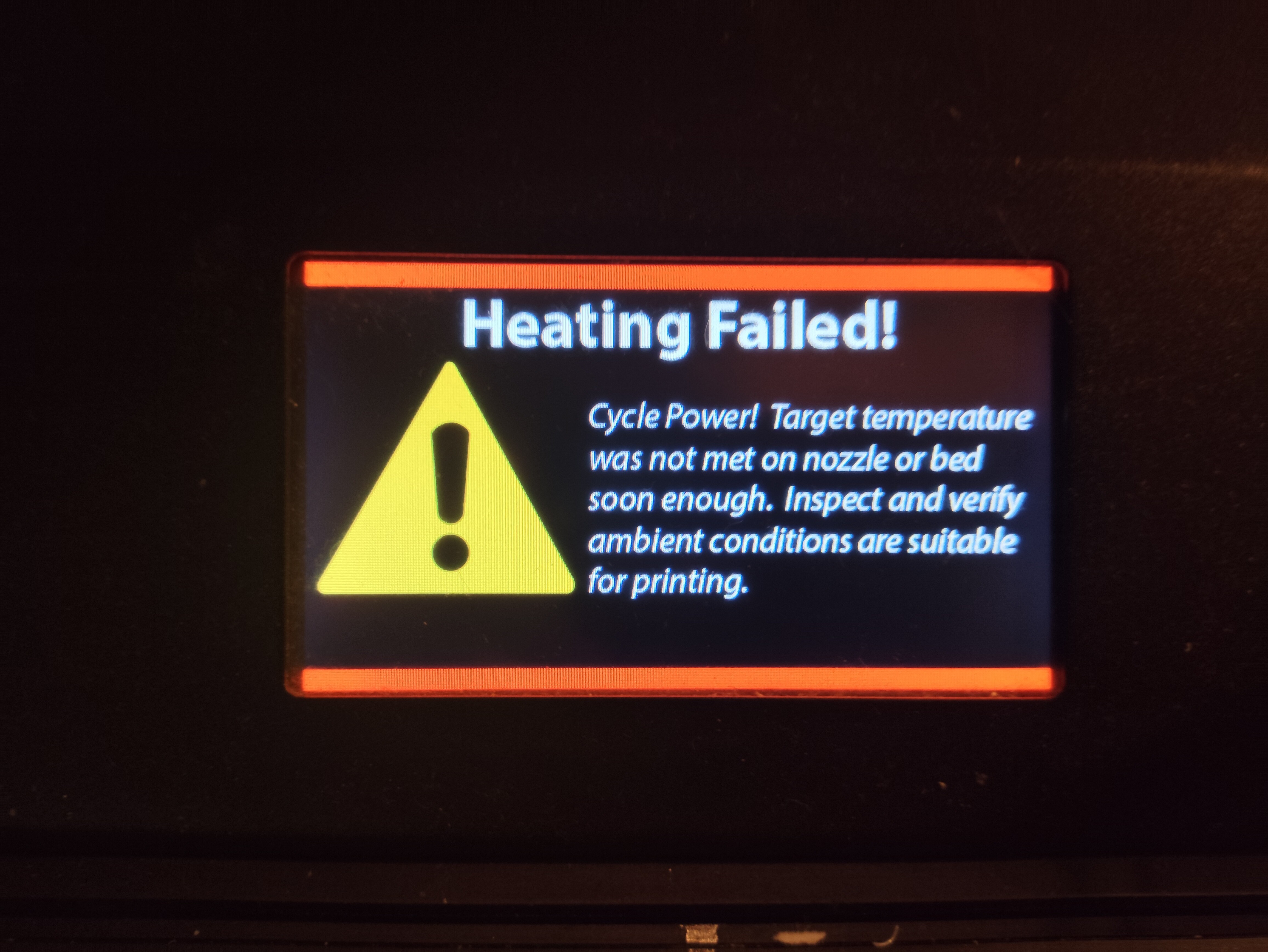 2) Трудности с нагревом экструдера. Температура не поднимается выше 220. Температурную башню не печатает, выдает ошибку, которую я сфотографировал ( прикладываю фото). Сообщает, что долго нагревает и просит проверить температуру окружающей среды. В комнате +23 градуса. Прочитал, что у принтеров при подобной проблеме рекомендуют замену термистора и калибровку PID. Стоит ли провести эти мероприятия или дело в другом?