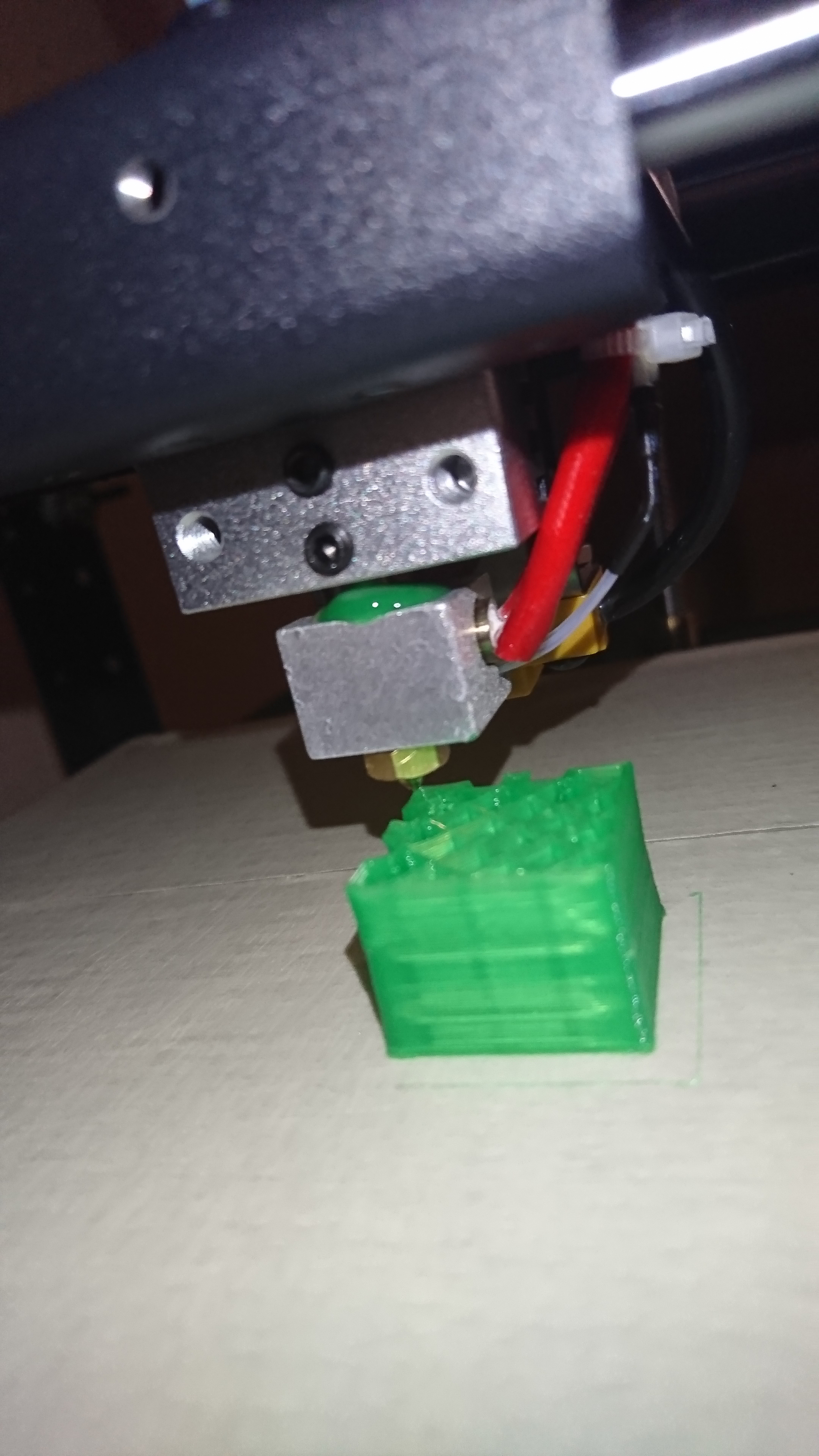 Новый который шел с принтером сломался. Прислали части. Собрал вроде как мне кажется верно. Сопло врутил до конца, хотэнд после сопла. Но при печати давит пластик через хотэнд (На фото вылезло примерно за 15-20 минут печати). В чем может быть причина?