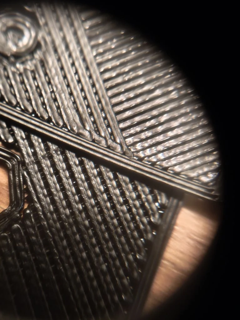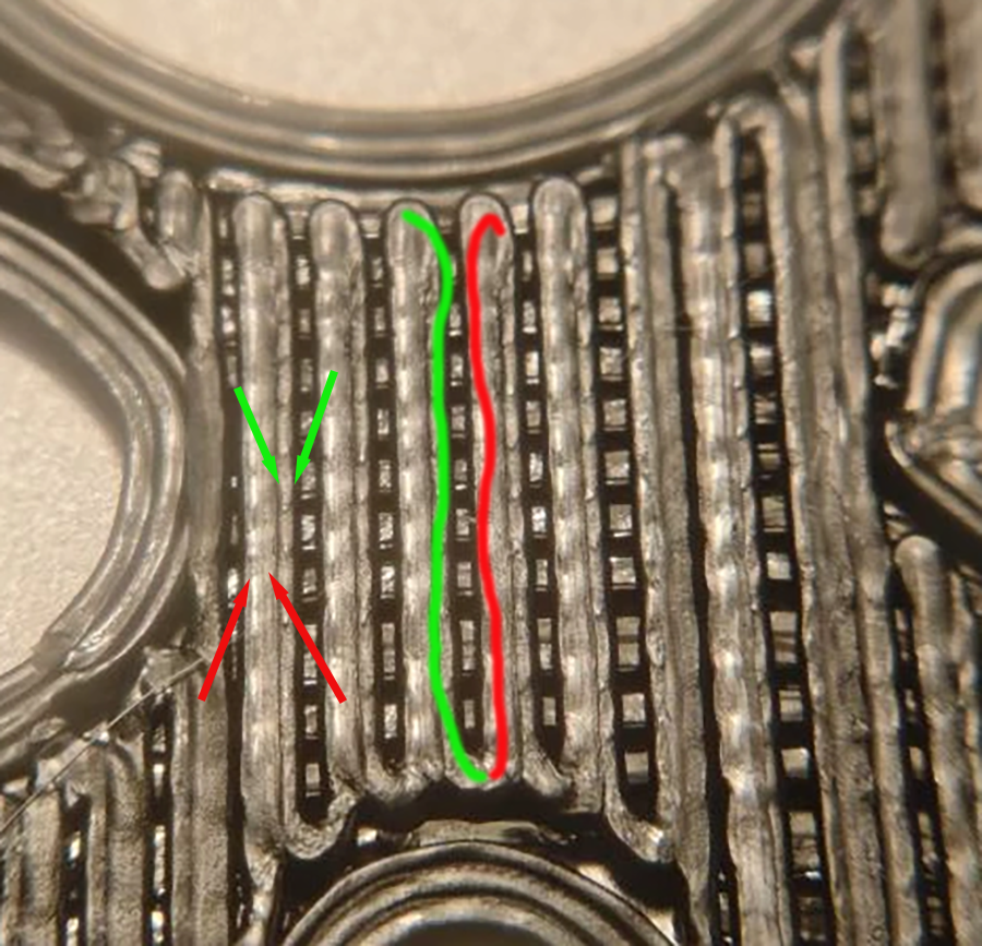 что я вижу ? что полосы экструзии идущие в разных направлениях слипаются, а в других наоборот разъезжаются, причем ширина выделенная зелеными стрелками явно тоньше чем ширина выделенная красными. как так ?