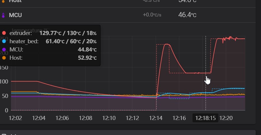 Здравствуйте, нужна помощь, не могу разобраться. Скачет температура экструдера и прошивка падает с ошибкой. вот такой график. ДУмал проблема в хоттенде, поменял на новый первая печать прошла нормально, потом опять. Снова перекрутил провода от датчика показалось, что там один контакт плохой, обкусил, воткнул. Первая печать нормально, потом опять.