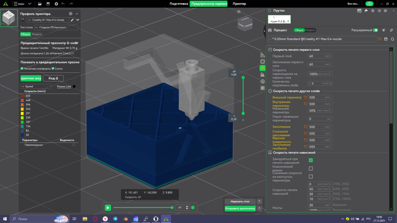 уже несколько дней пытаюсь поменять скорость печати в слайсере creality print и orca sliсer. Печаю на creality k1 max. какую скорость бы не выставлял все равно печатает медлено из за чего возникает рябь