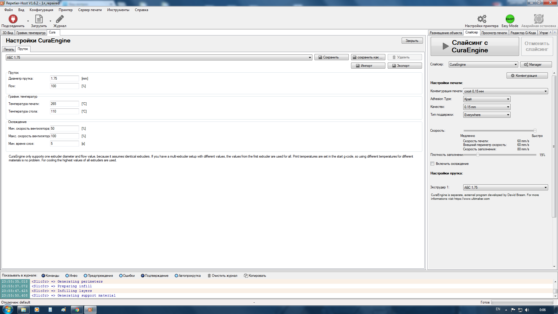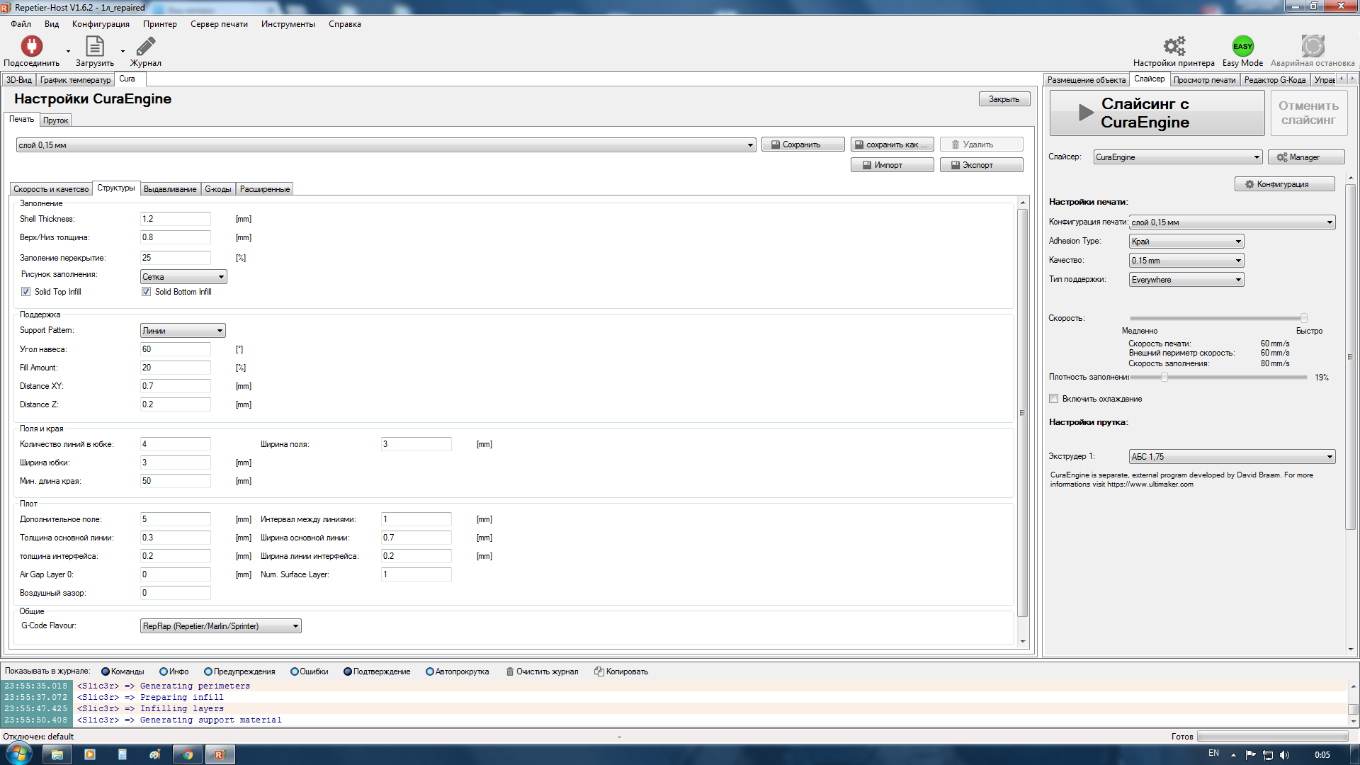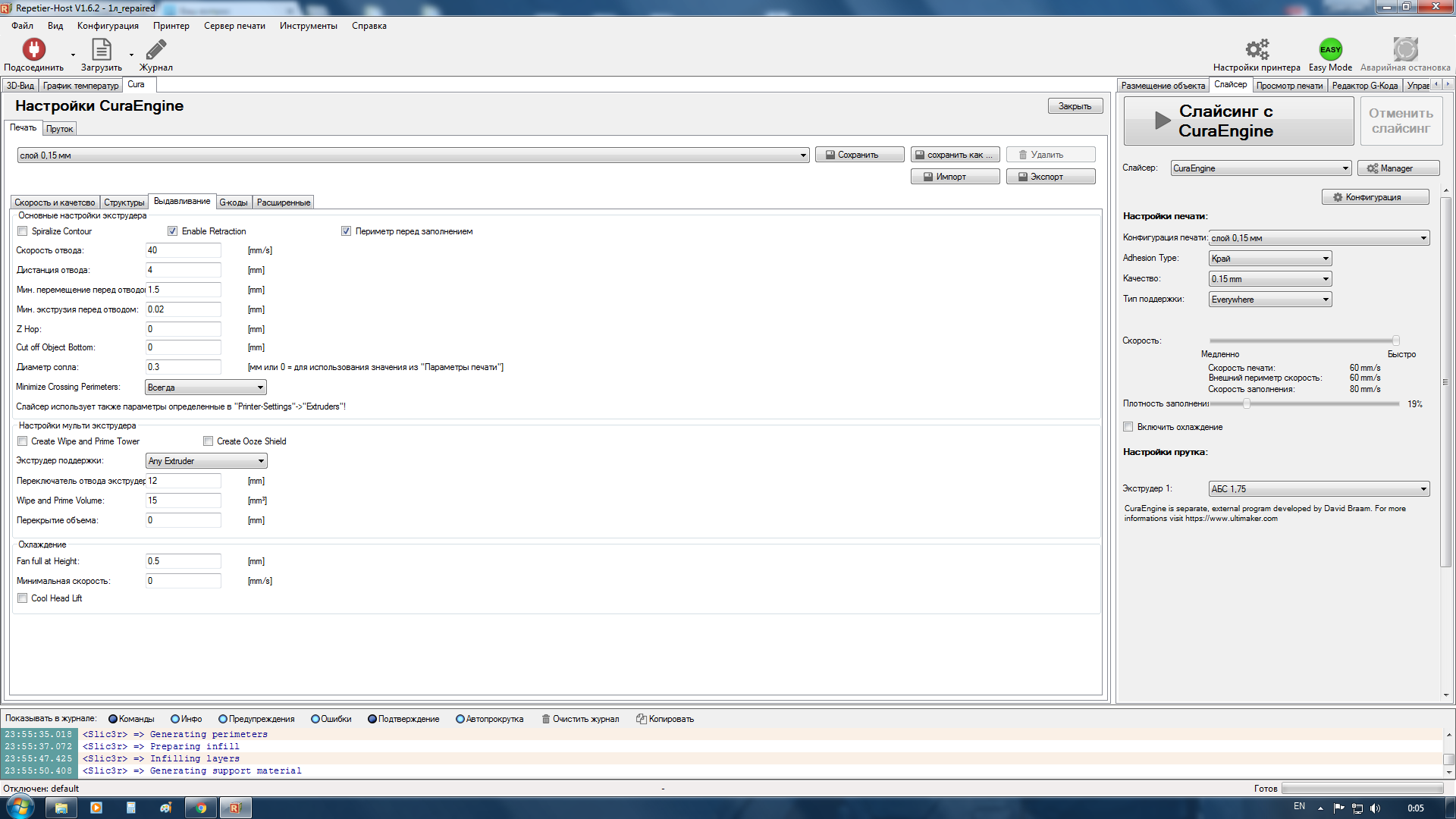 Проблема следующего характера... Вроде настроил слайсер по туториалу здешнему, все замечательно, все генерируется идеально на первый взгляд, но при начале печати экструдер находит ноль и уезжает по оси Z на 1-1,5 см (точно не замерял), после чего начинает печатать, само собой в воздухе... С Cura в принципе не работал никогда предпочитая Slic3r, но проблема в том, что модель которую хочу распечатать с поддержками генерирует только Cura...