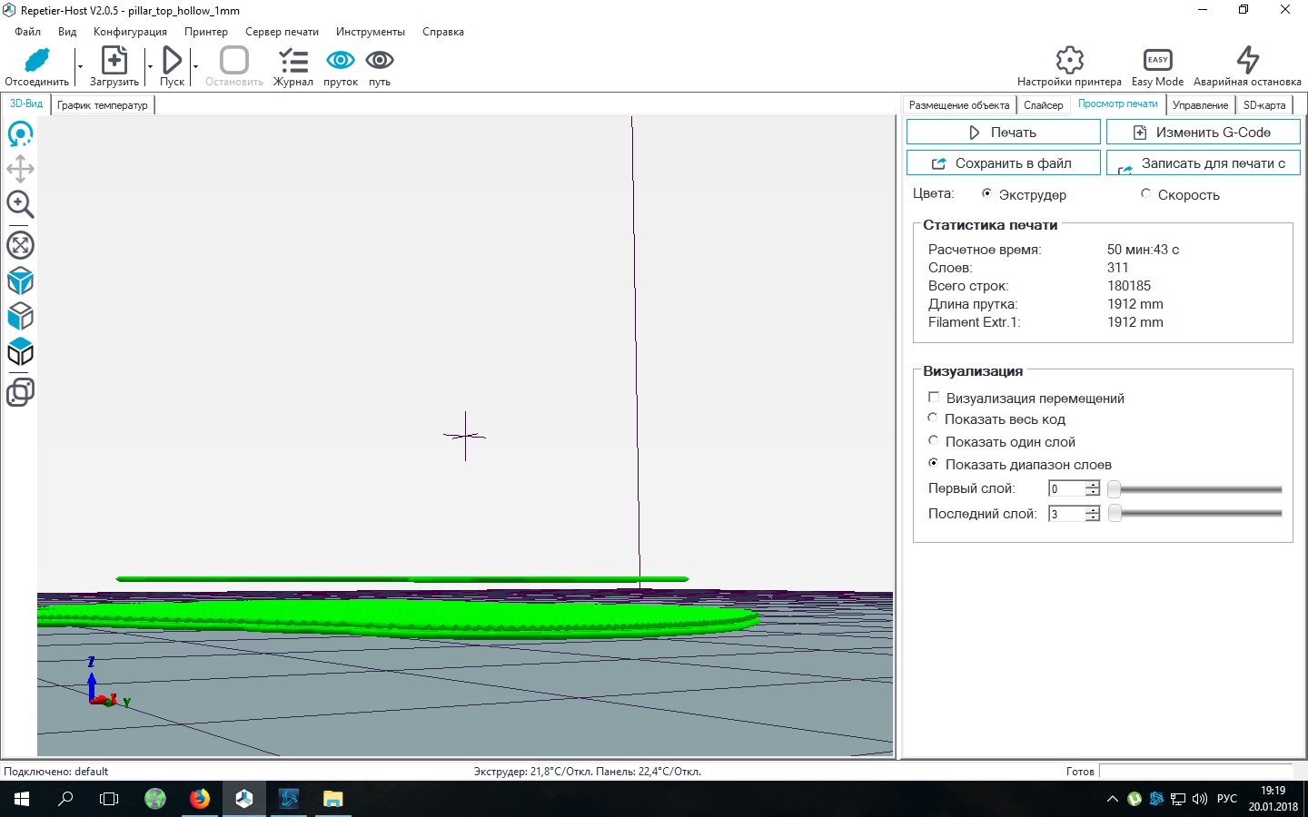 Доброго времени суток. Проблема такая Использую программу Repetier-Host, слайсер Cura и когда я ставлю печать самопомощью плота у меня 3 слой улетает на уровень 11-14 слоя, а если делаю юбку все нормально