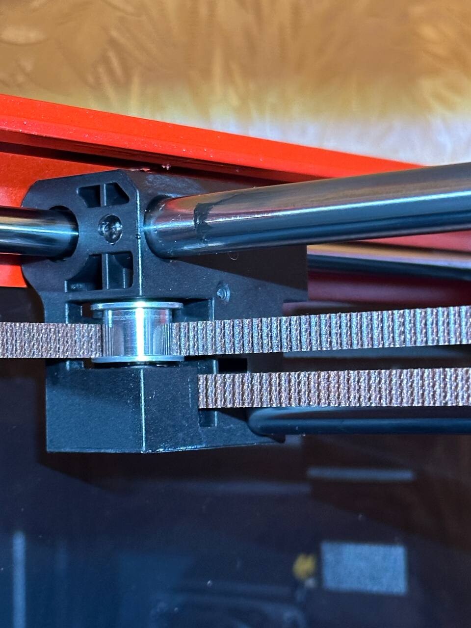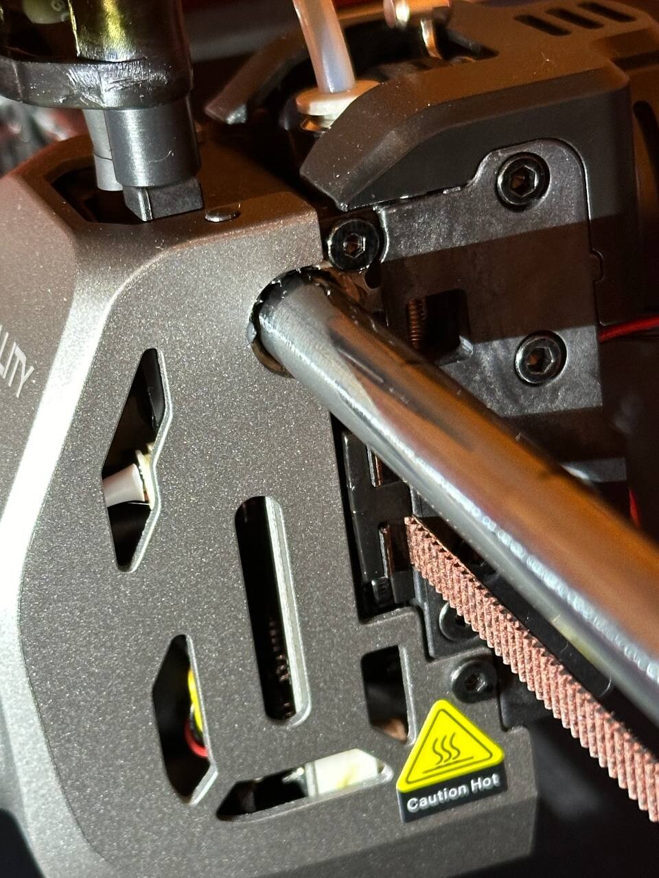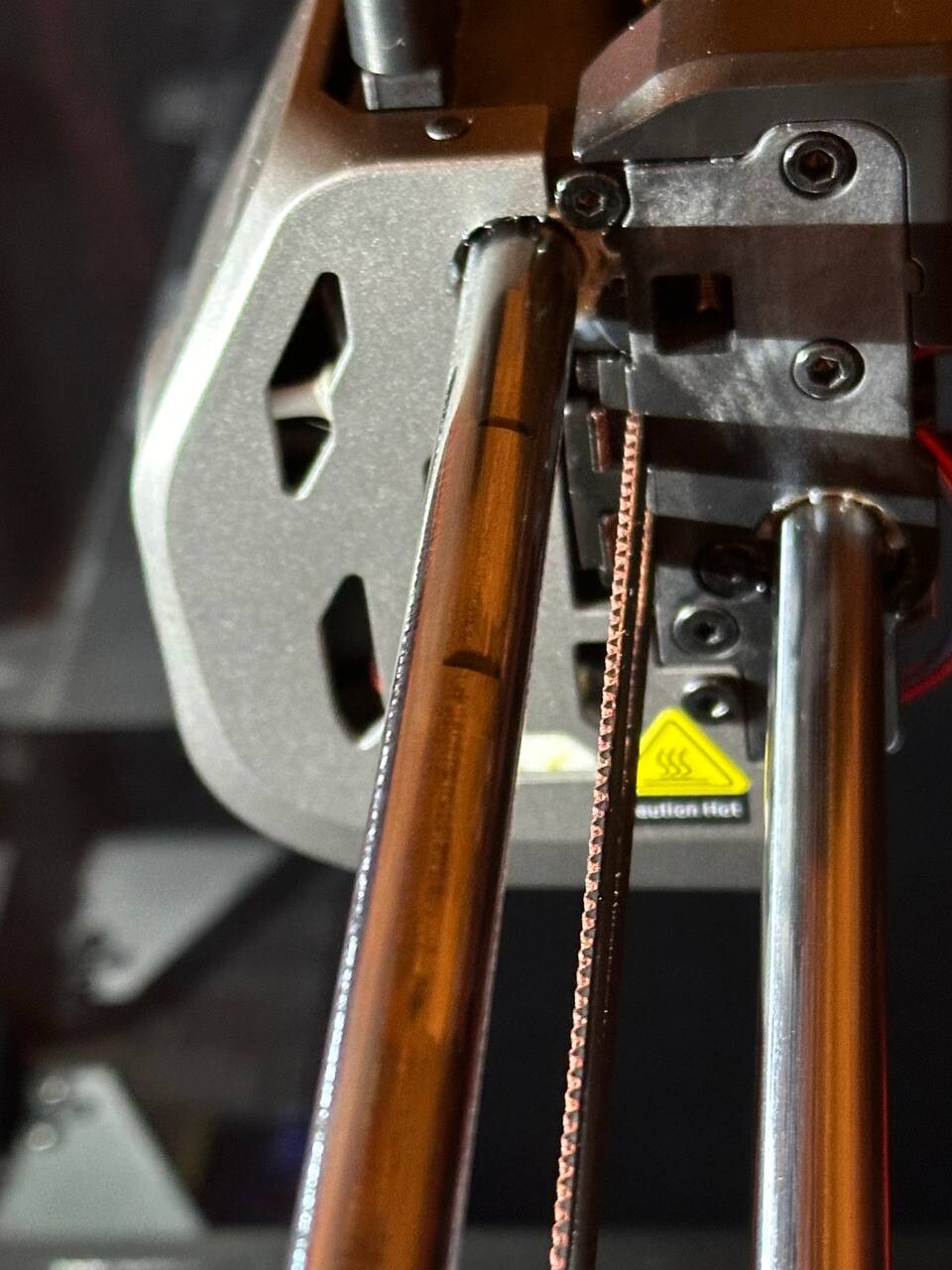 Добрый всем вечер! Недавно стал обладателем принтера creality k1c, спустя счастливых нескольких процессов заметил неприятную картину: на направляющий, держащей экструдер, появились пятна цвета расплавленного филамента. они возникают при смене направления движения сопла, при этом сама направляющая будто в масле.. Фото корпуса, из которого идет течь, прилагаю