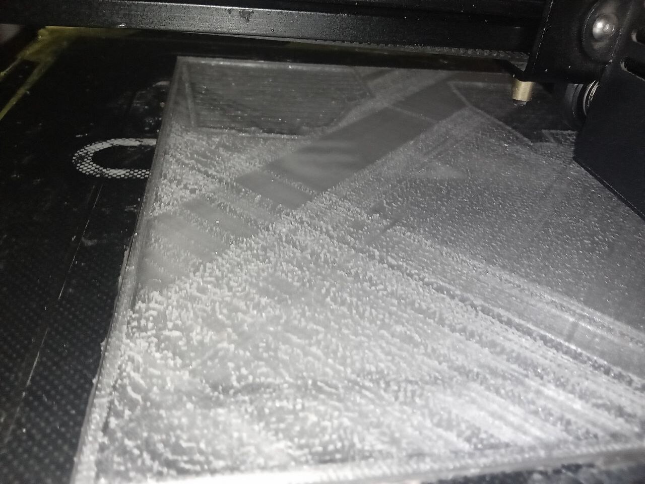 Поставил печататься литофанию на 2 с лишним суток соплом 0.2. в какой то момент печать начала происходить подобным образом, (см. картинку) Что это вообще такое, в чем может быть причина? Прищепка на двигателе подачи прижимает вроде нормально, правда постукивает, откатывая пруток назад.